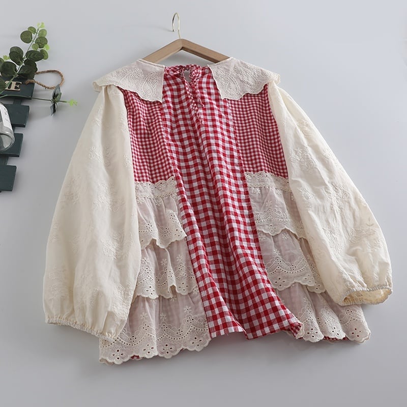 ピコット襟刺繍入りギンガムチェックレースシャツ W1208