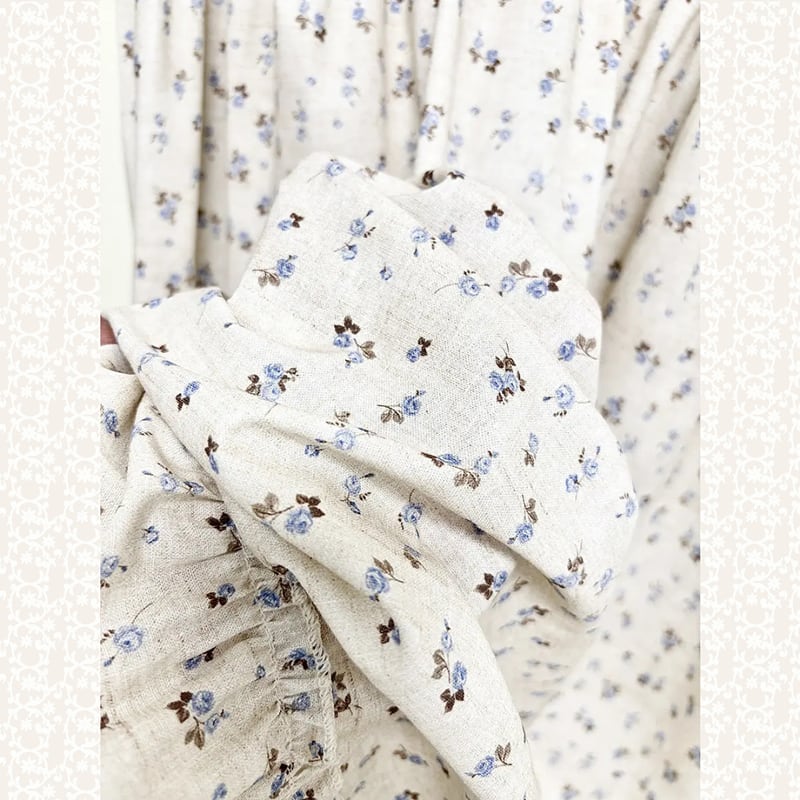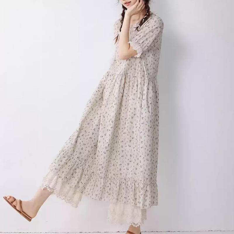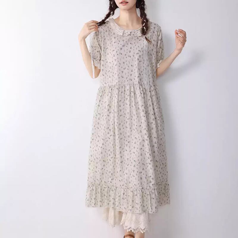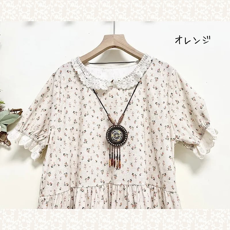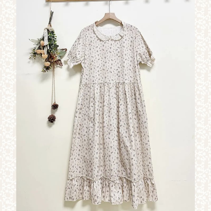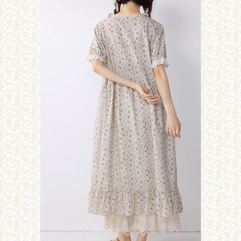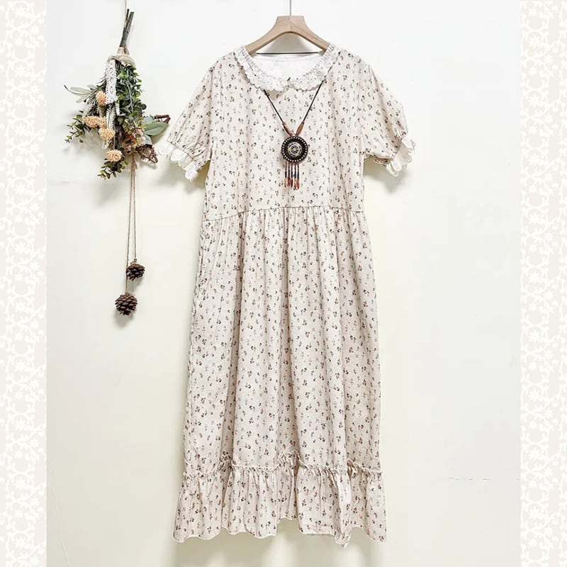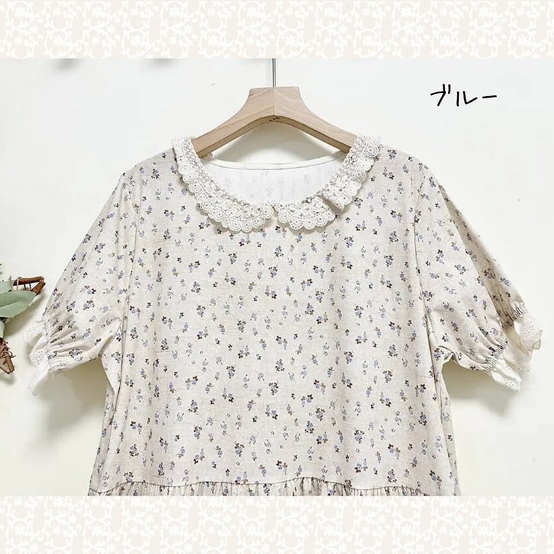 花柄とレース襟のコットンワンピース W1307