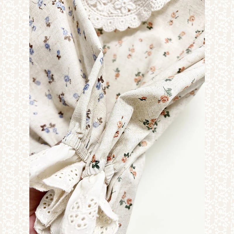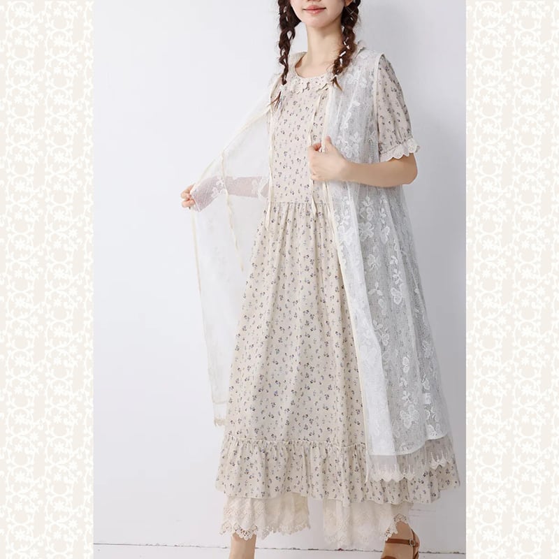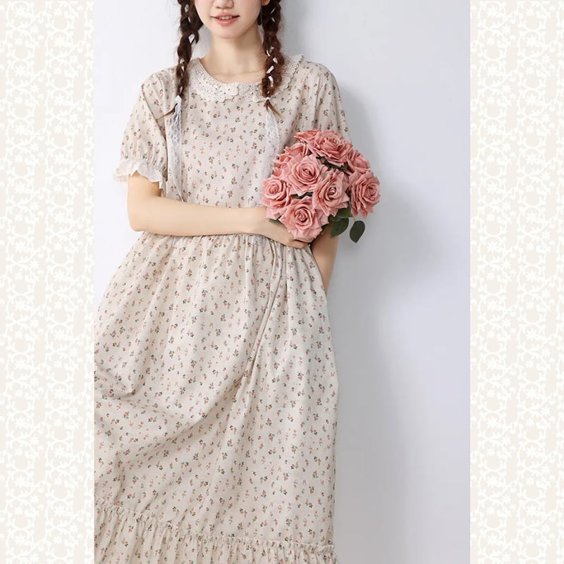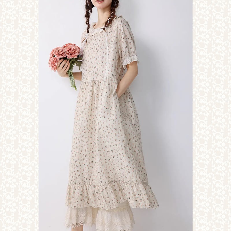 やわらかなコットン地に可憐な花柄が映える、クラシカルなレース襟つきワンピース。