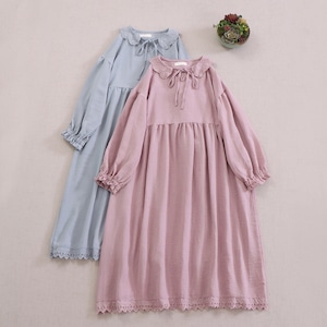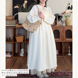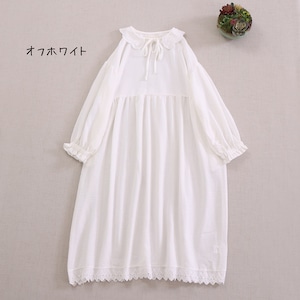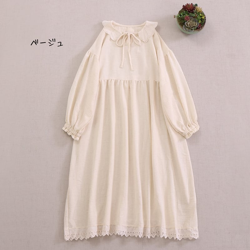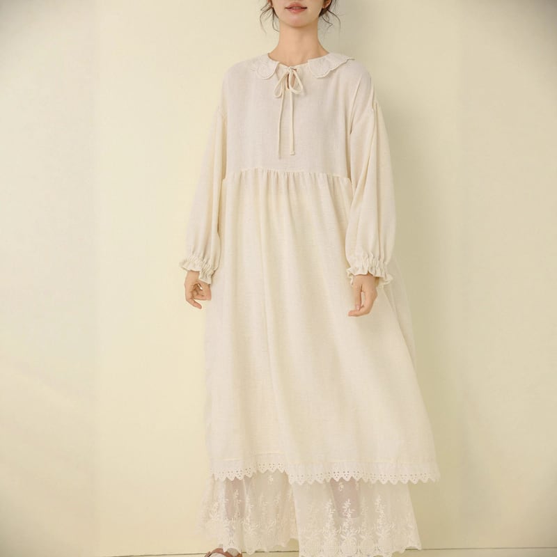 レースカラーがやさしく映える、森の雰囲気をまとうローブワンピース。
