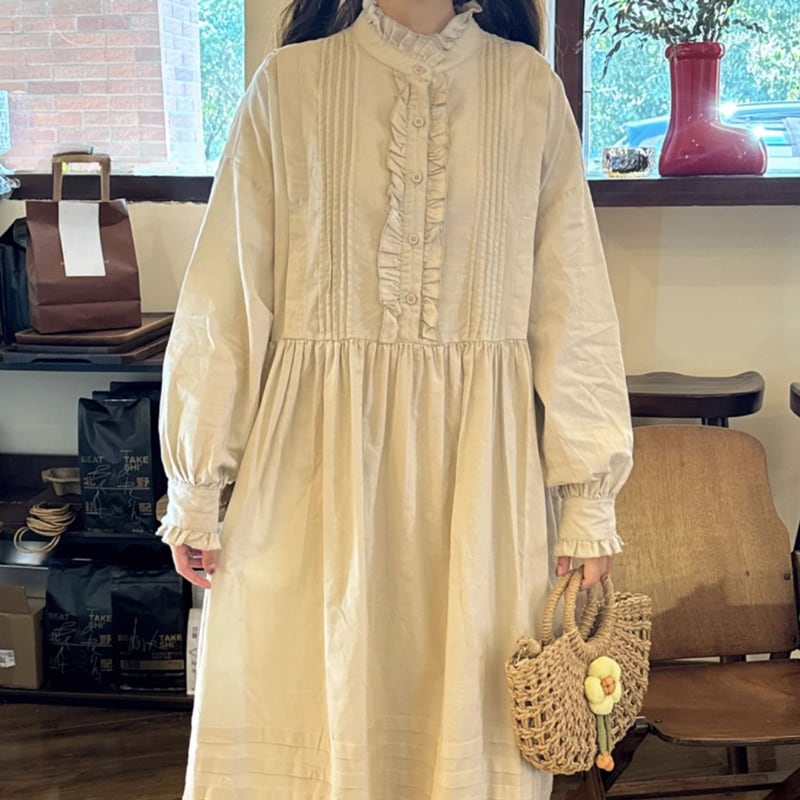 首元のフリルスタンドカラーがクラシカルな印象を添えるロングワンピース。