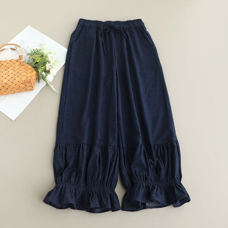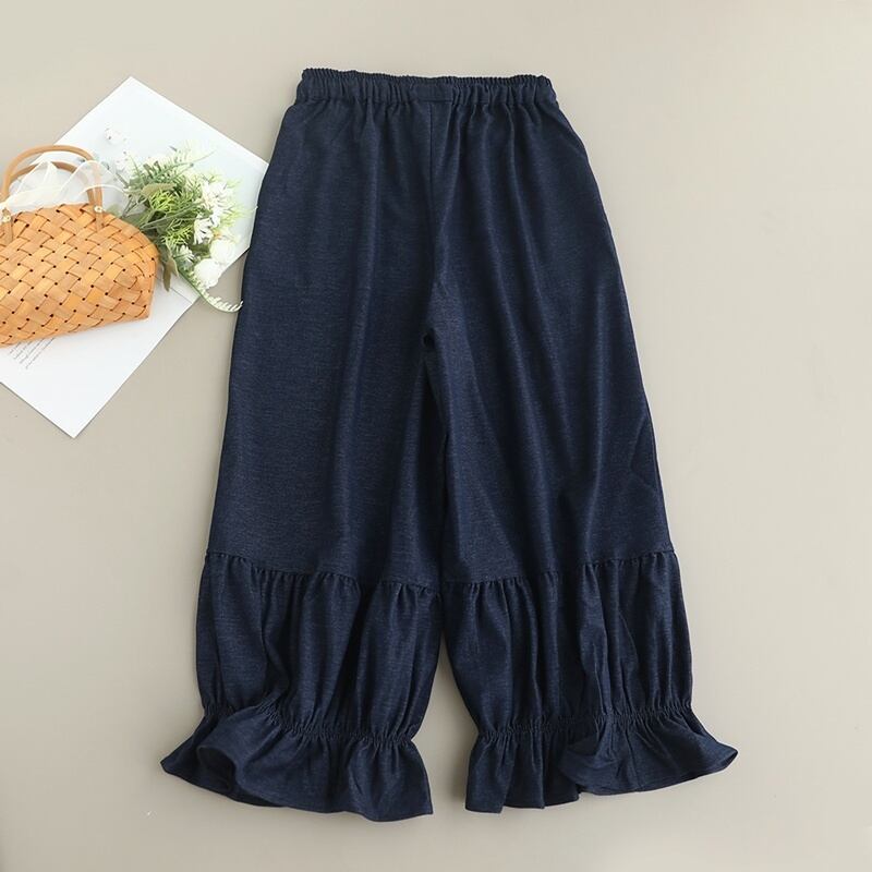 裾フリルとギャザーがフェミニンな印象をプラスするワイドデニム。