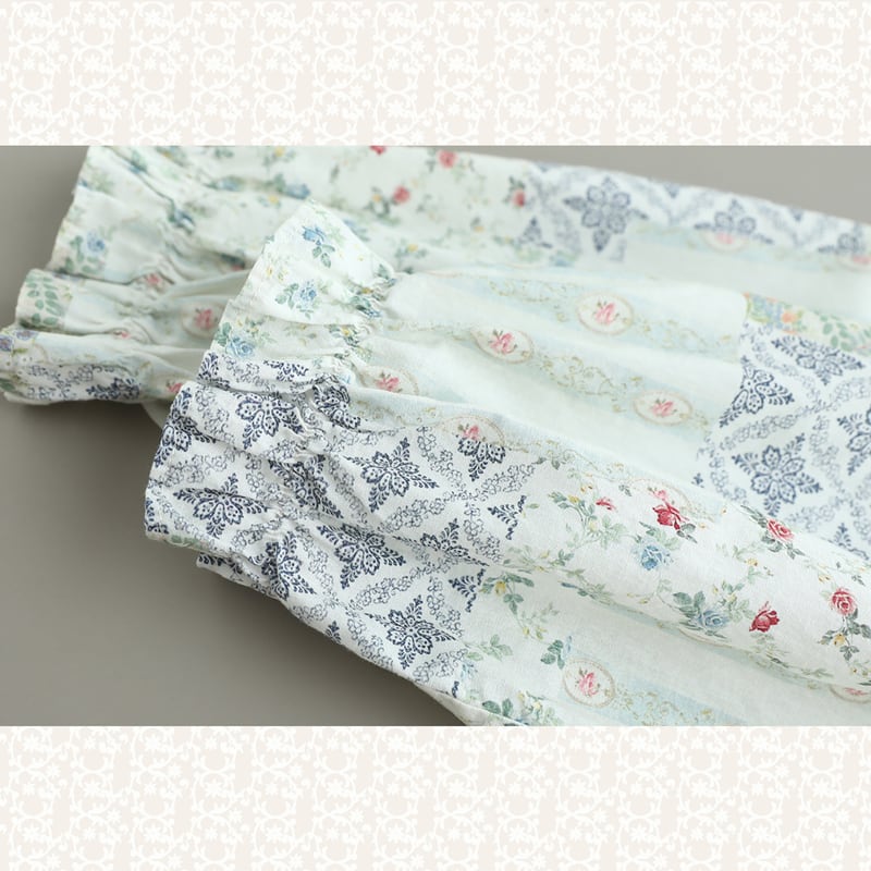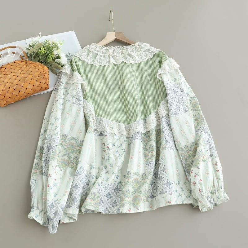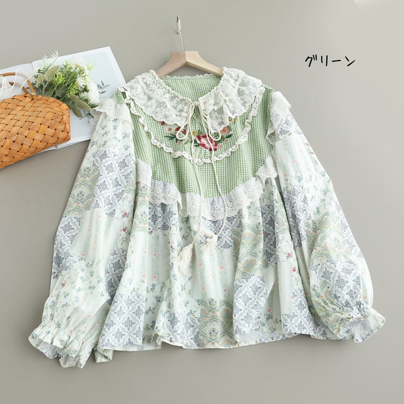 フラワー刺繍レース切り替えデザインロングスリーブシャツ W1462