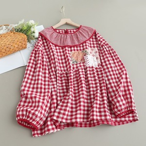 ギンガムチェックのパッチワークが可愛らしいパフスリーブシャツ。
