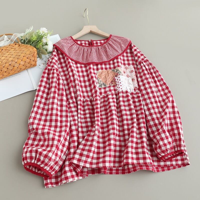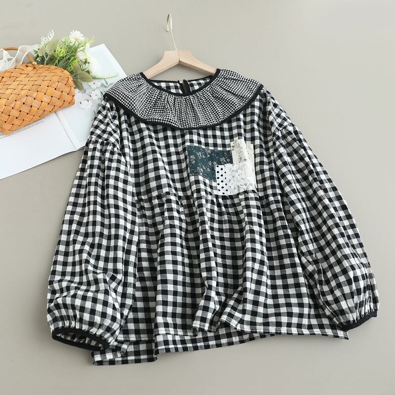 ギンガムチェックパッチワークパフスリーブシャツ W1464