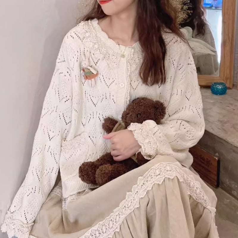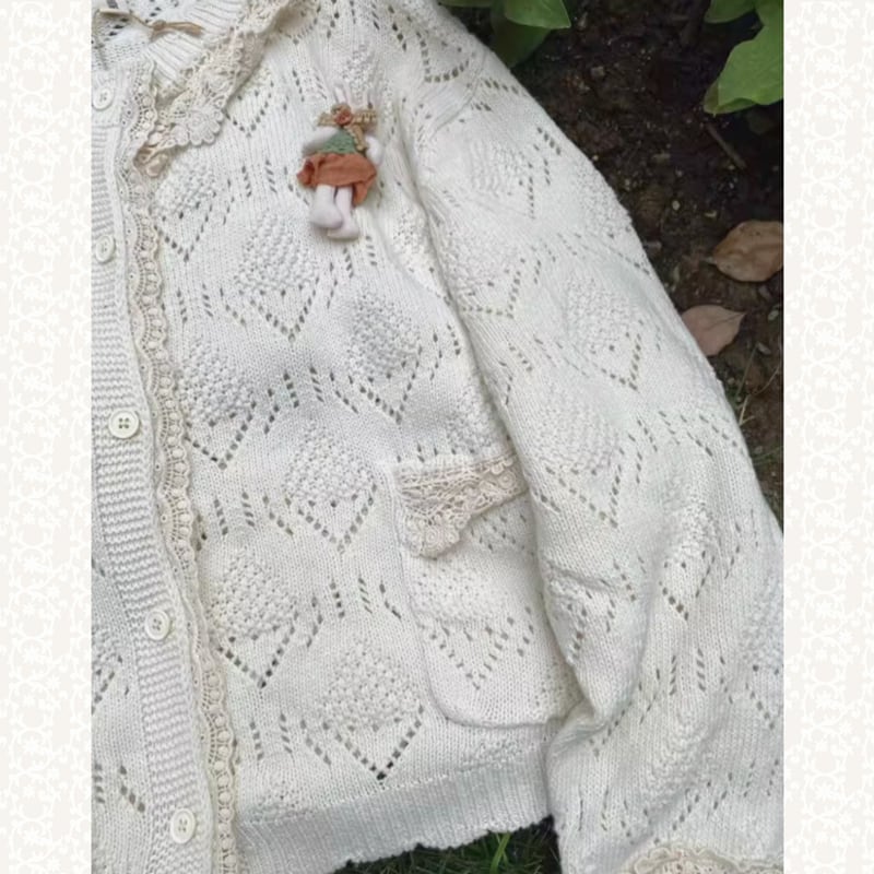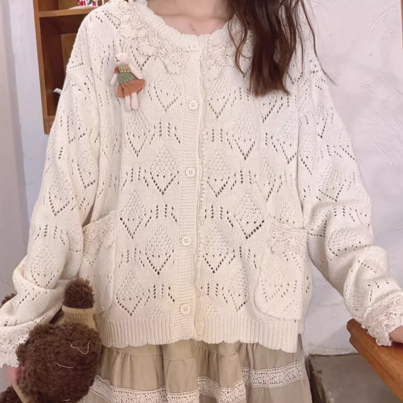 繊細な透かし編みとボタンフロントが軽やかな印象のニットカーディガン。