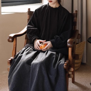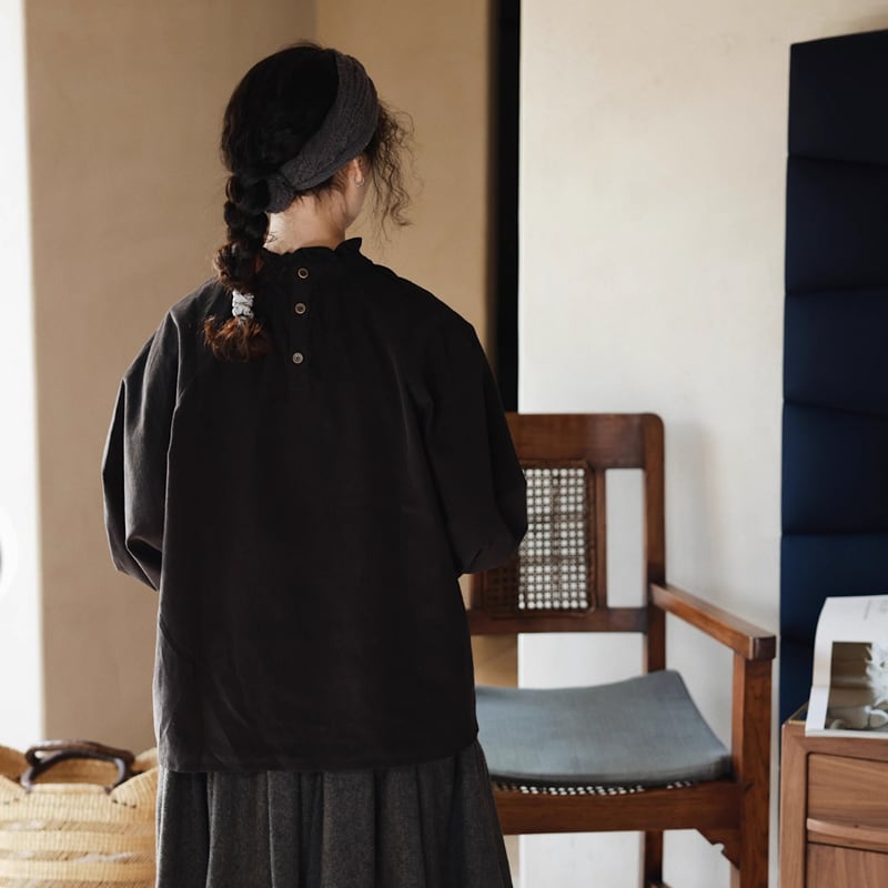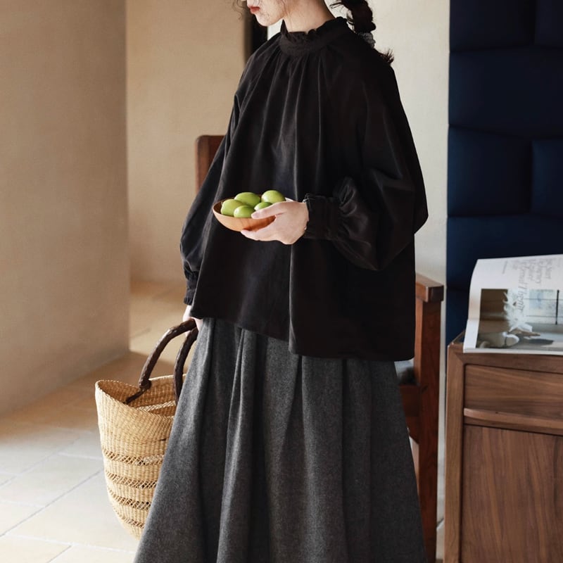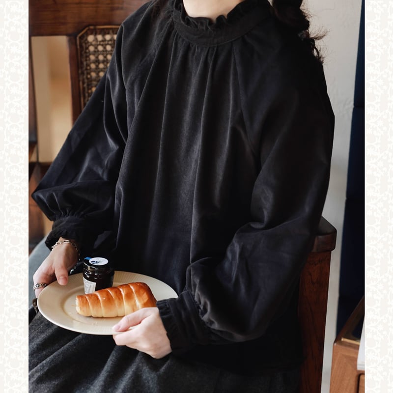 フリルネックバックボタンコーデュロイランタンスリーブシャツ W1473