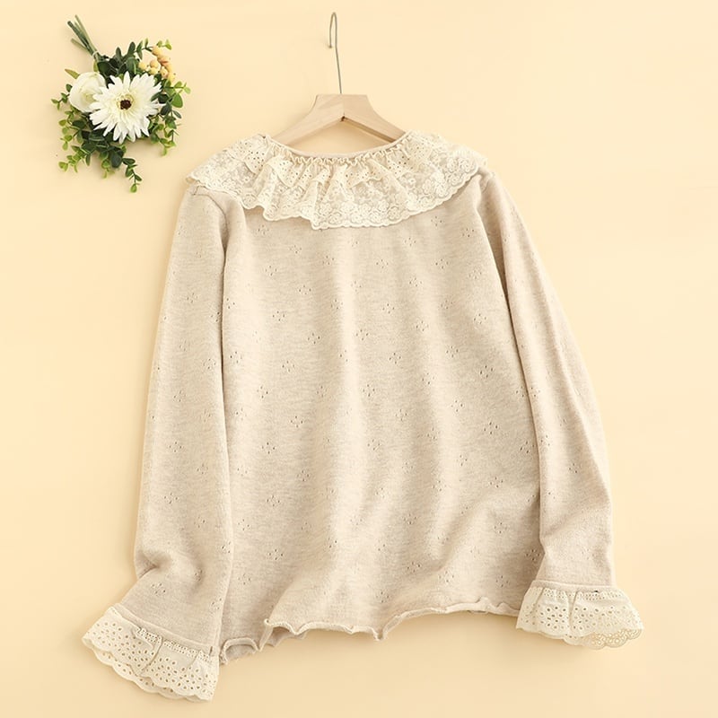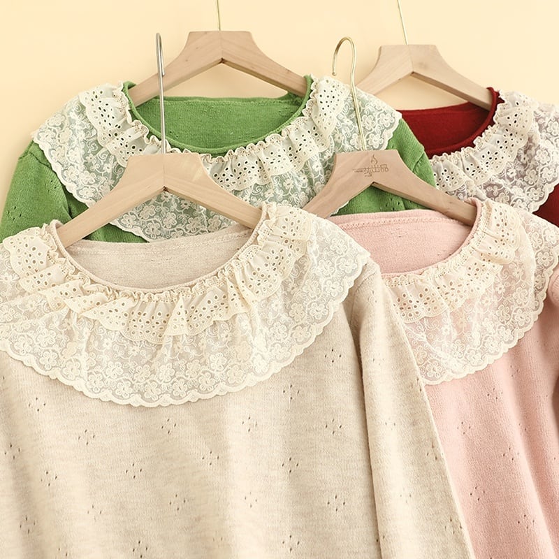 ラウンドネックとレース襟が上品な長袖ニットセーター。
