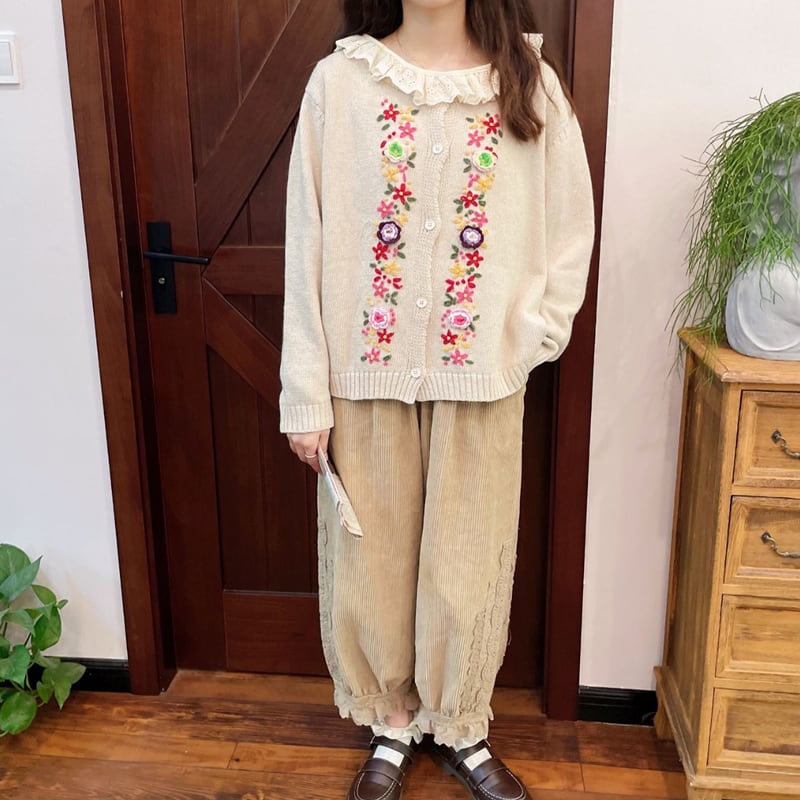 サイドのレースデザインがさりげなく華やぐコーデュロイつぼみワイドパンツ。