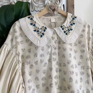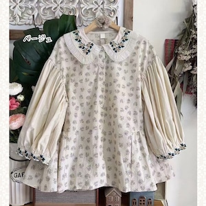 フラワー刺繍が可憐に咲くレトロなランタンスリーブブラウス。