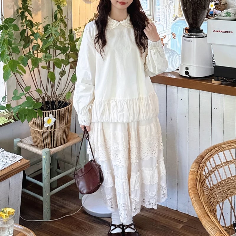フリルのドールカラーが愛らしい裾ギャザーデザインシャツ。