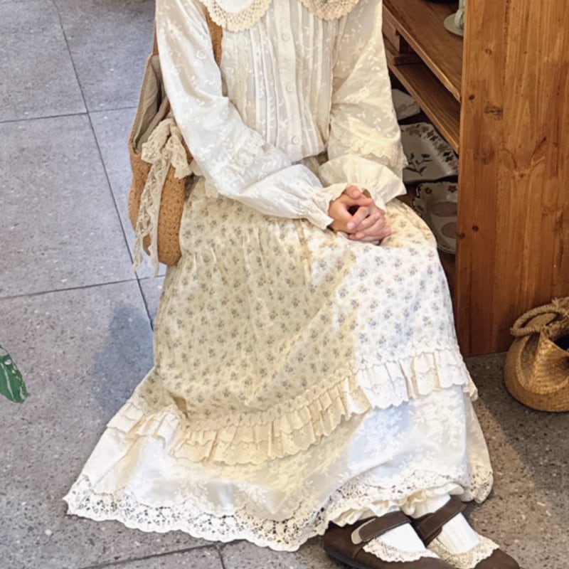 森を思わせる小花柄とレースが愛らしいティアードスカート。