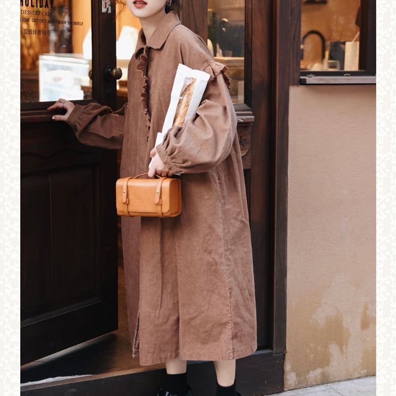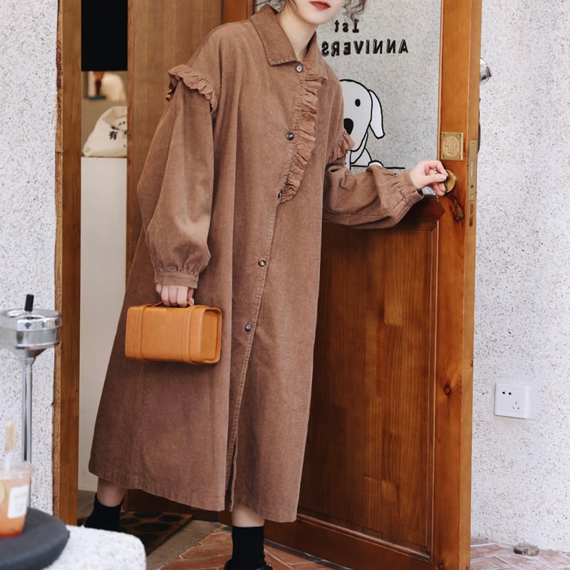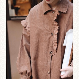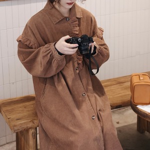 コーデュロイにレースを重ねたロングジャケットワンピース。