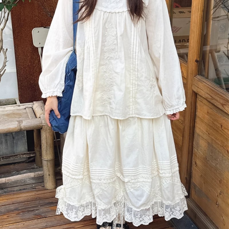 繊細なレースステッチとリボンが可憐に揺れる、裾フレアスカート。