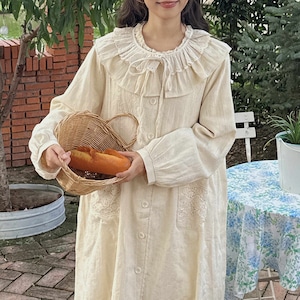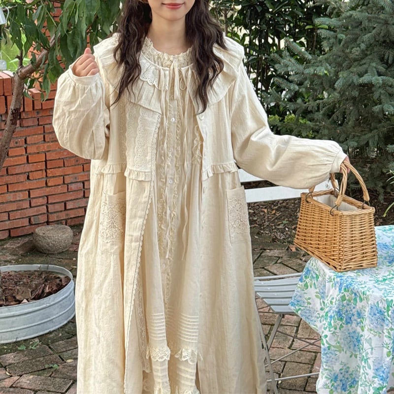 重なり合うロータスカラーが優雅な表情を生むコート風ワンピース。