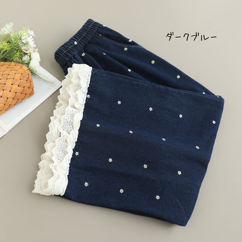 小花刺繍入りストレートワイドデニムパンツ W1539