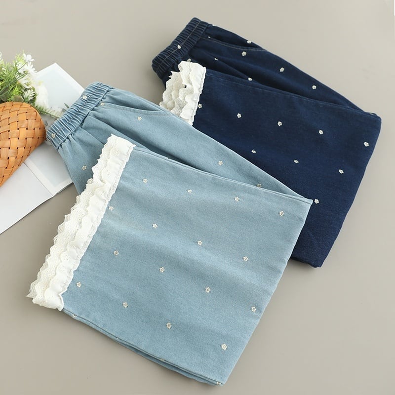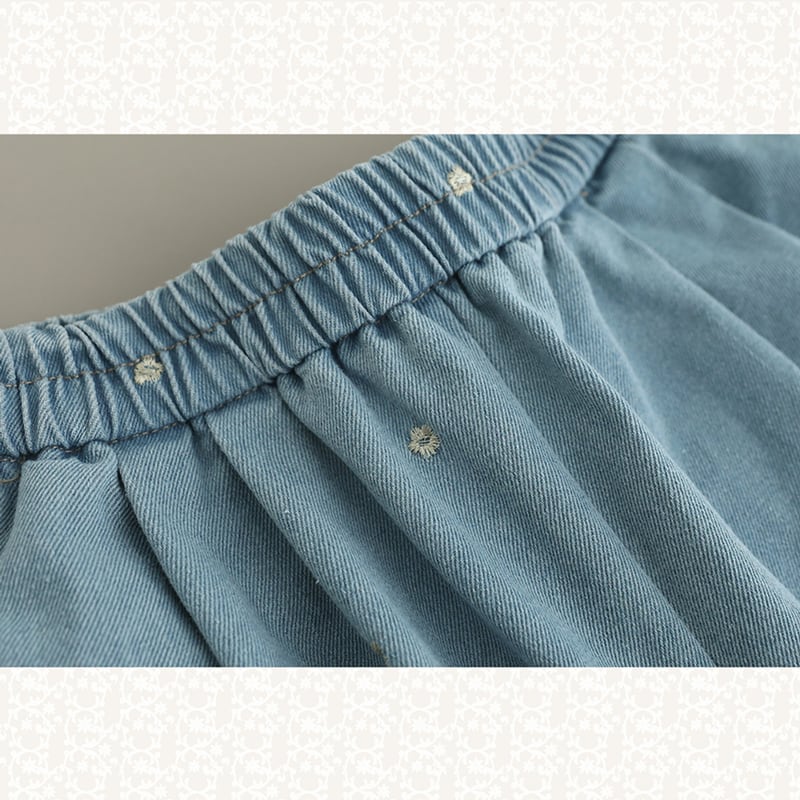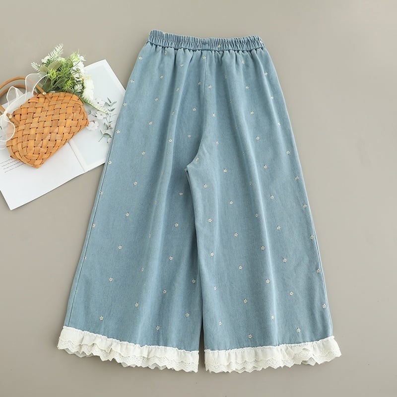 小花の刺繍が愛らしいアクセントになったストレートワイドデニムパンツ。