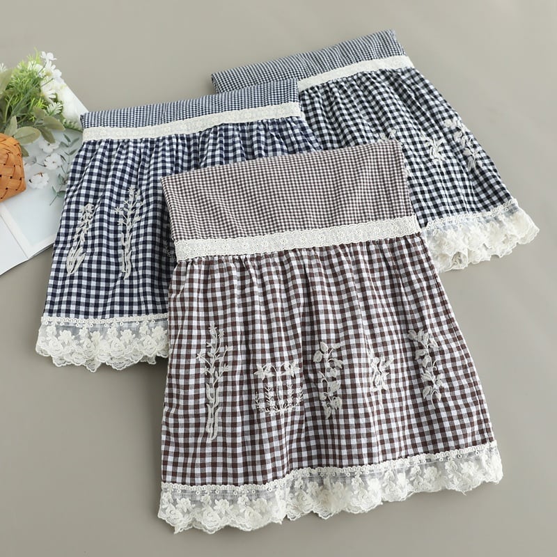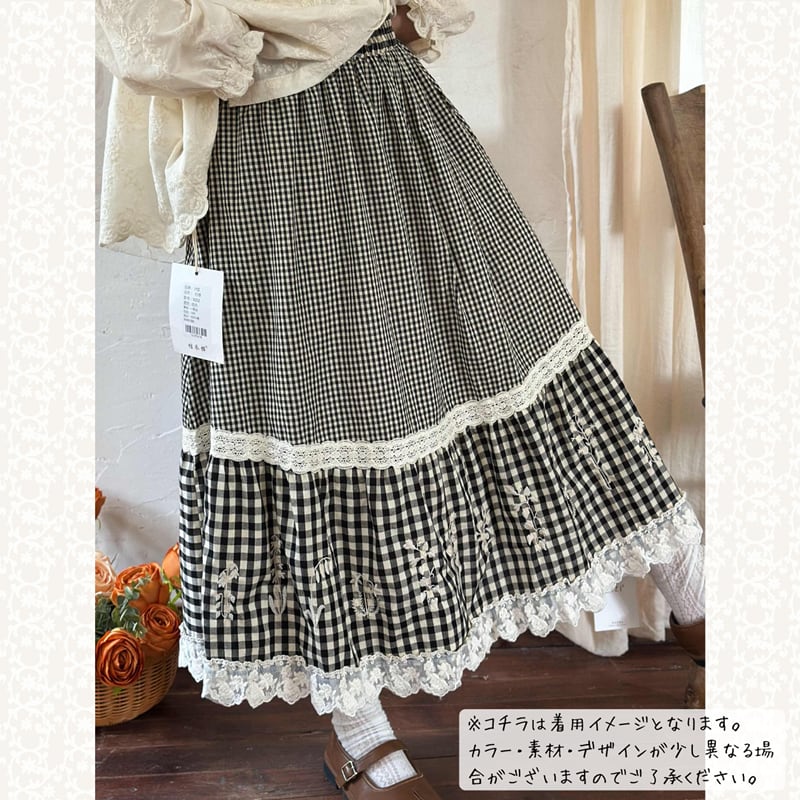 ギンガムチェックと刺繍レースの切り替えが可憐なスカート。
