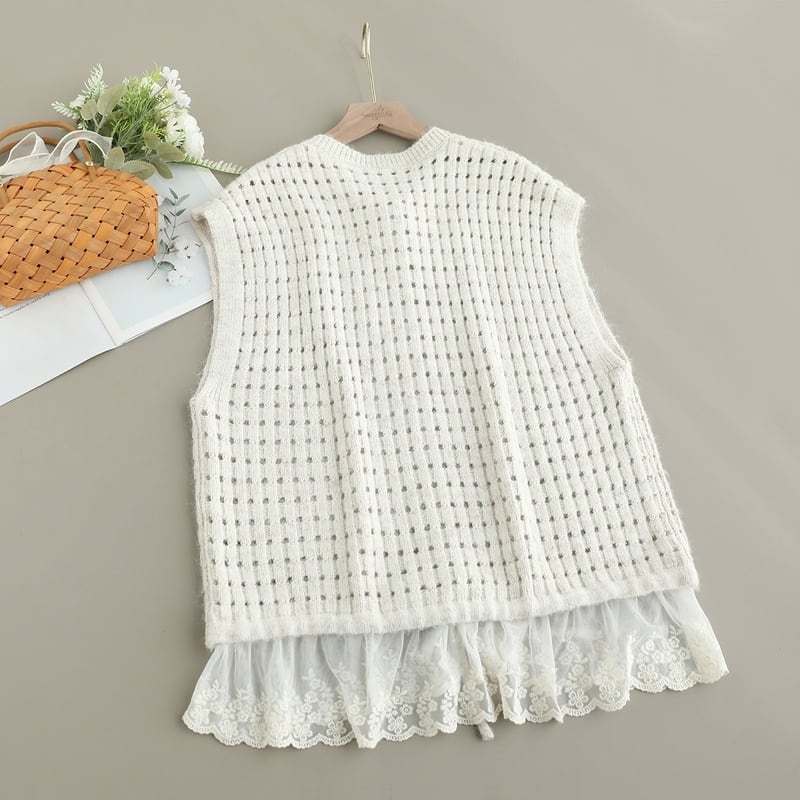 リボン付きレースレイヤードノースリーブニットベスト W1556