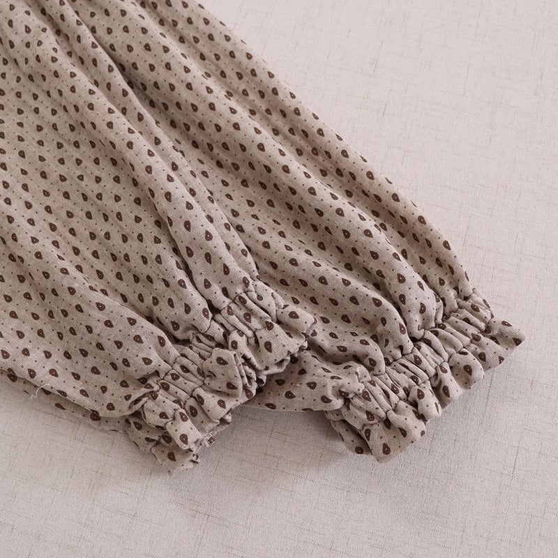 柔らかなコットン生地に散りばめられた水滴のような模様が、静かな可憐さを演出します。
