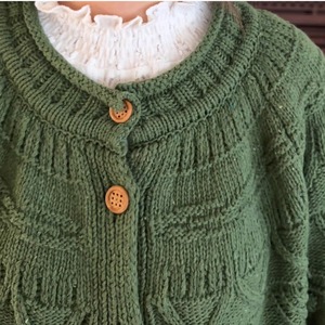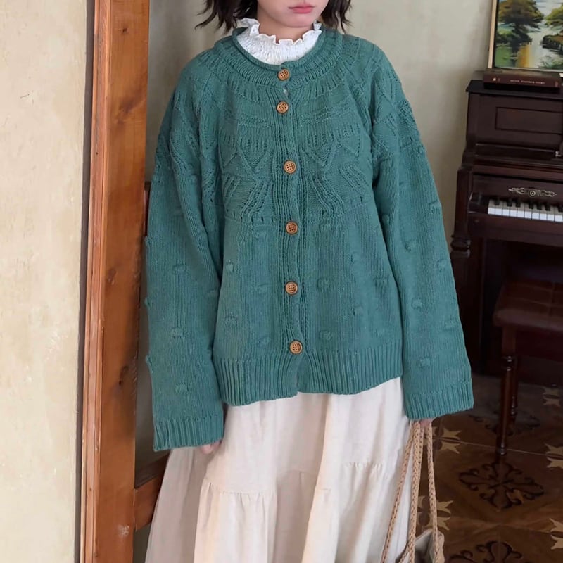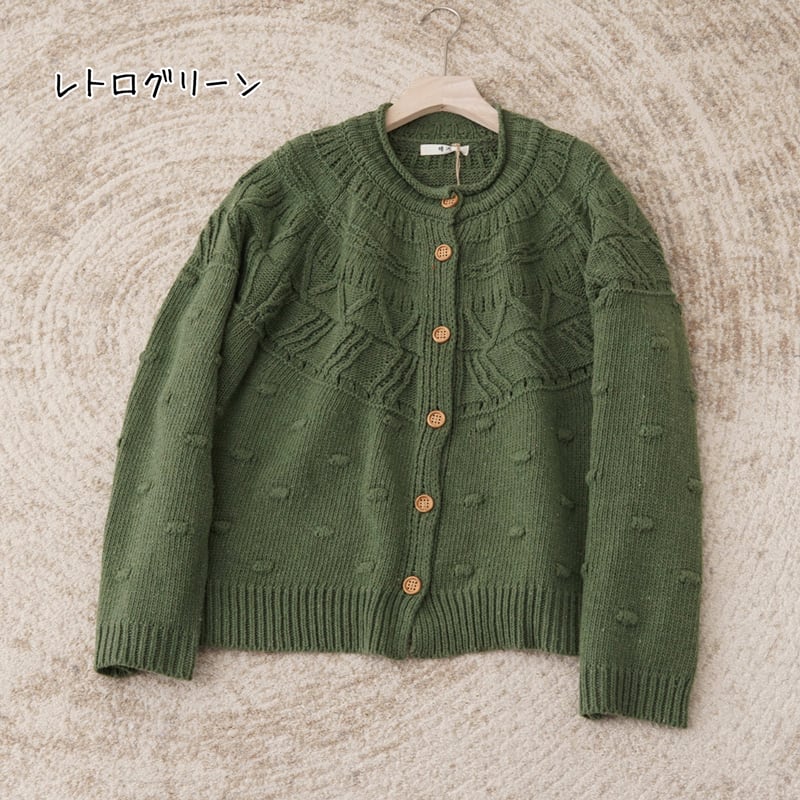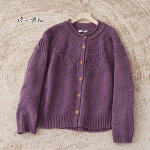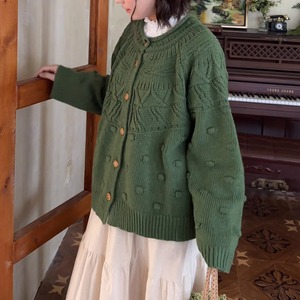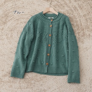 可愛らしいドット柄が目を引くフロントボタンのニットカーディガン。