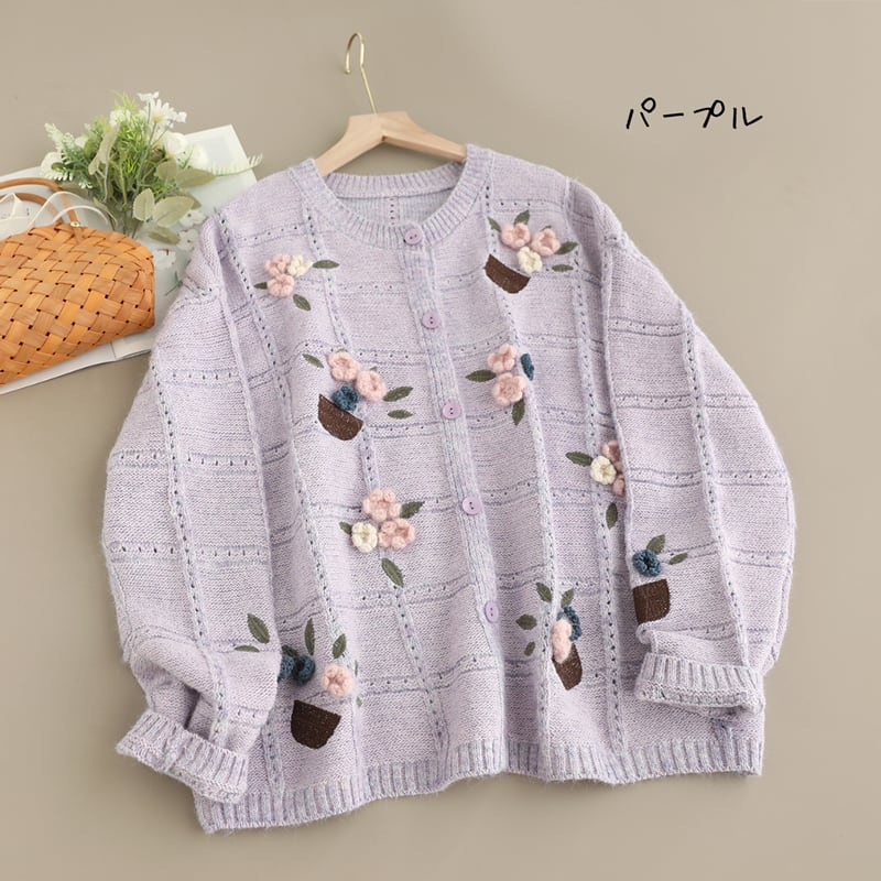 立体フラワー刺繍ラウンドネックニットカーディガン W1602