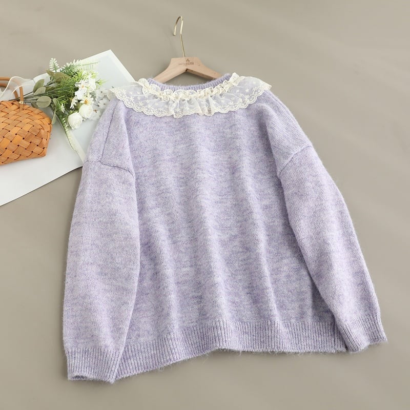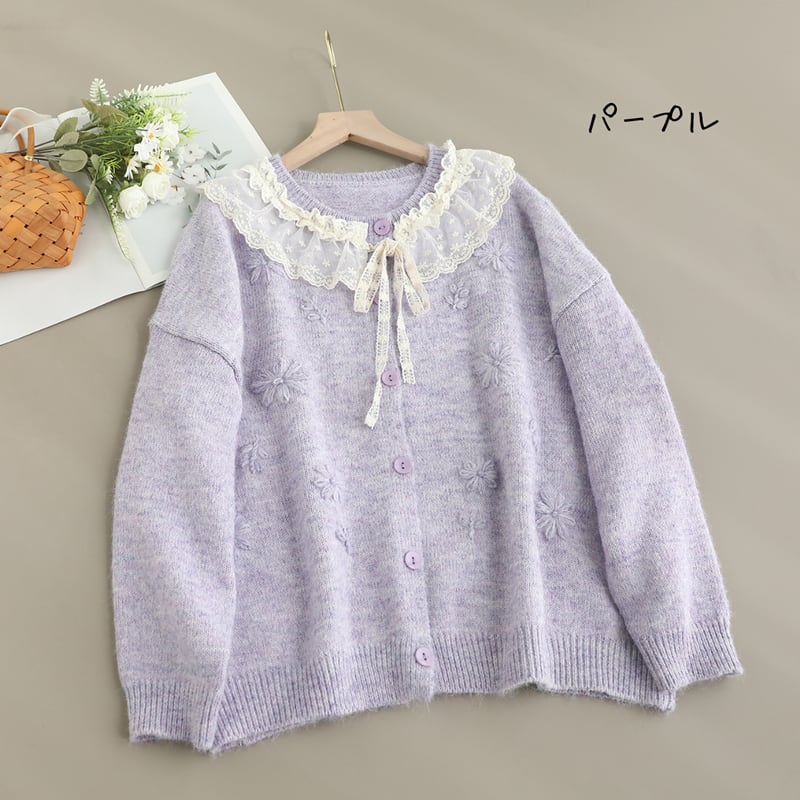 繊細なレース襟が印象的なラウンドネックカーディガン。