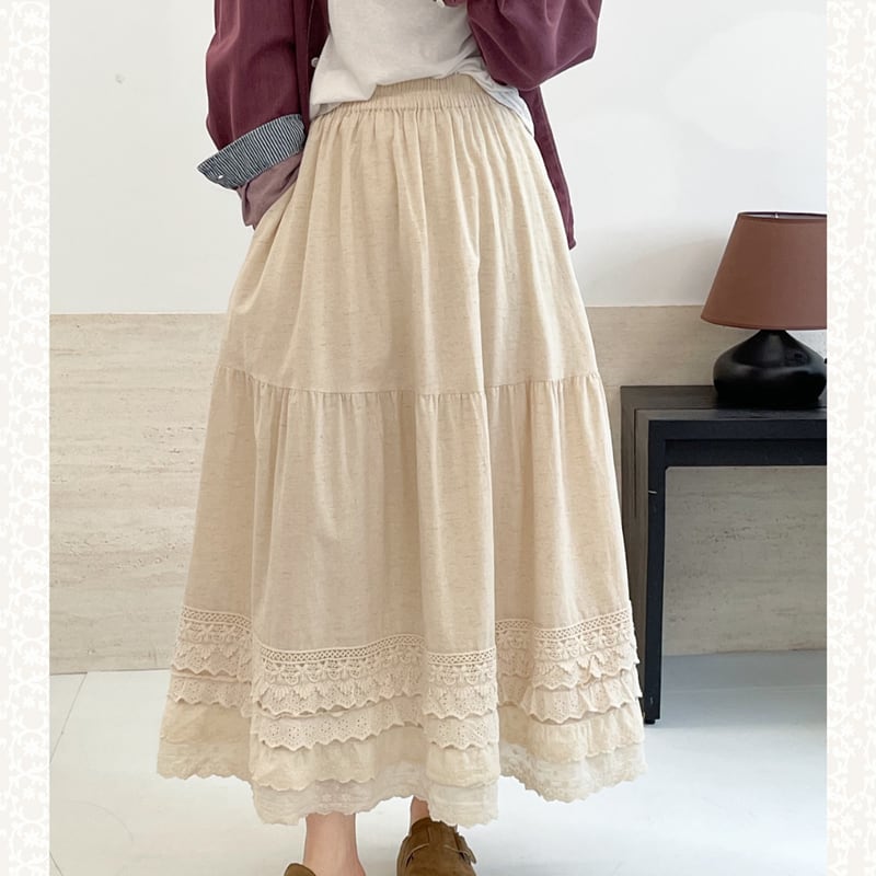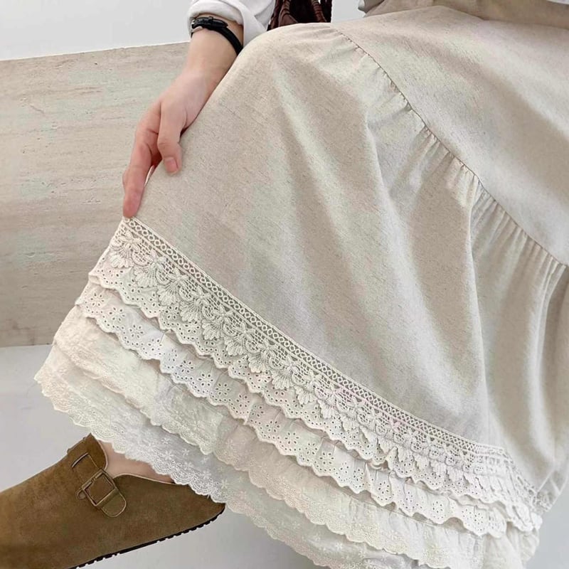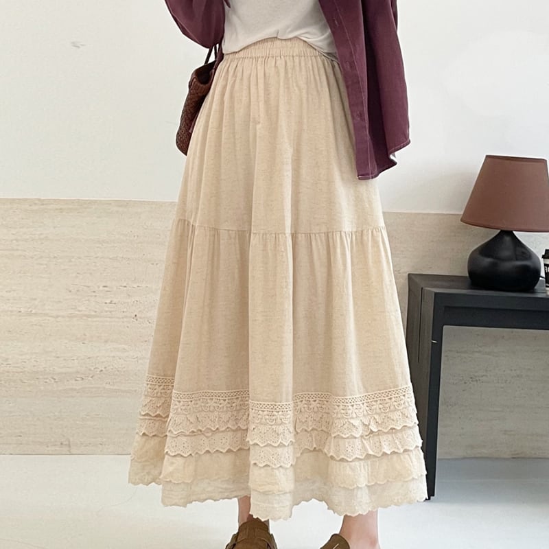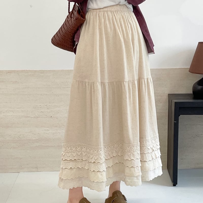 重なり合う繊細なレースが美しい、ナチュラルなティアードスカート。