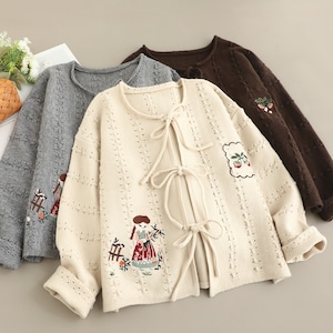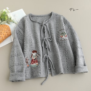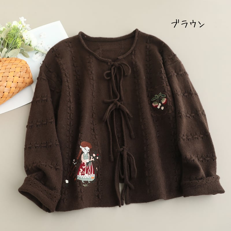 フロントのリボンと繊細なフォレスト刺繍が目を惹くカーディガン。