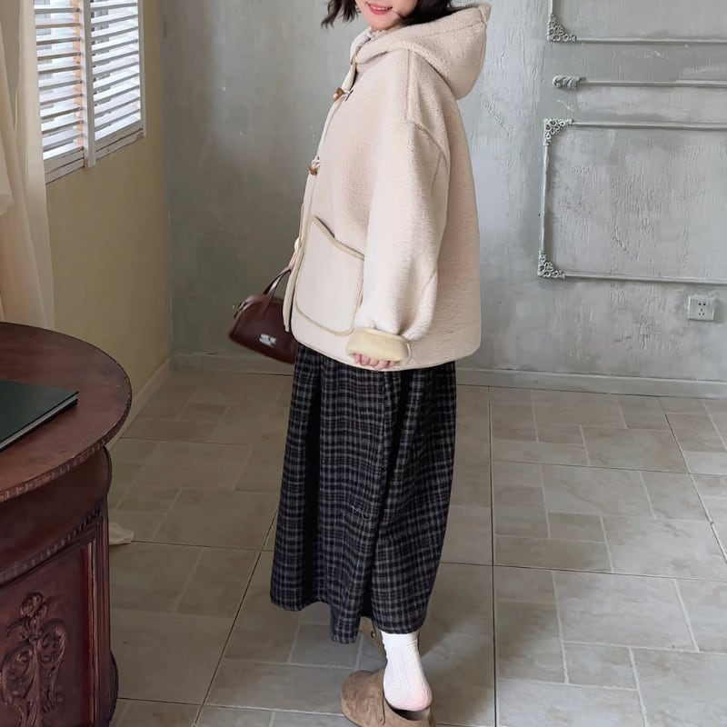 トグルボタンがアクセントになった、ふんわり可愛いフード付きショートコート。