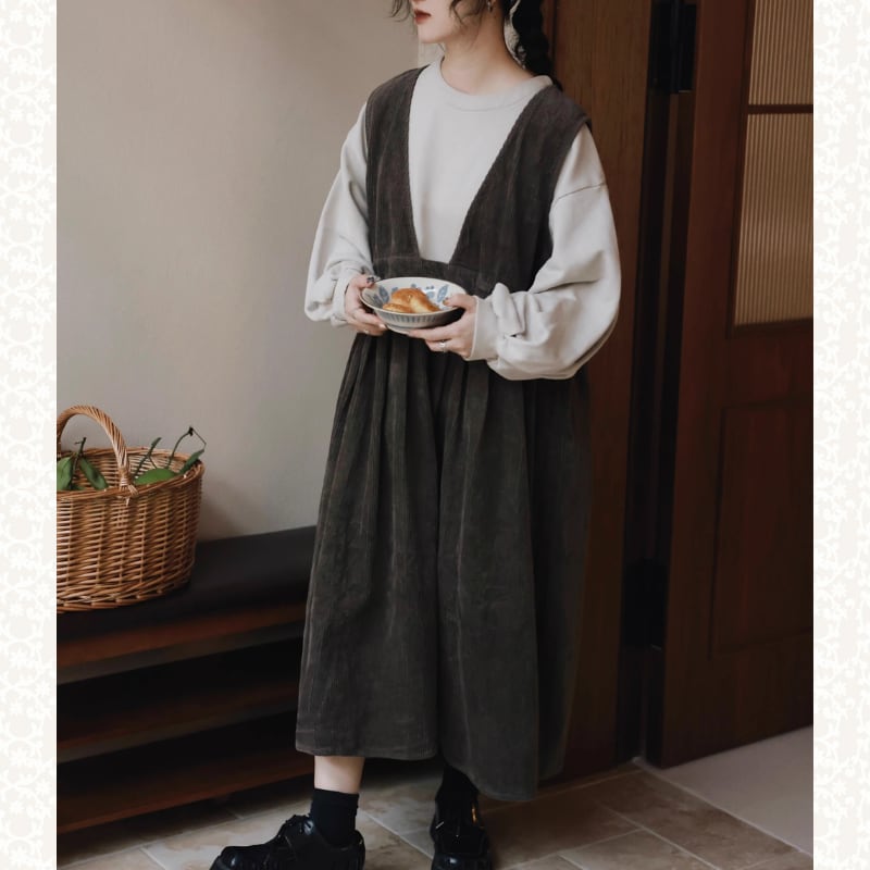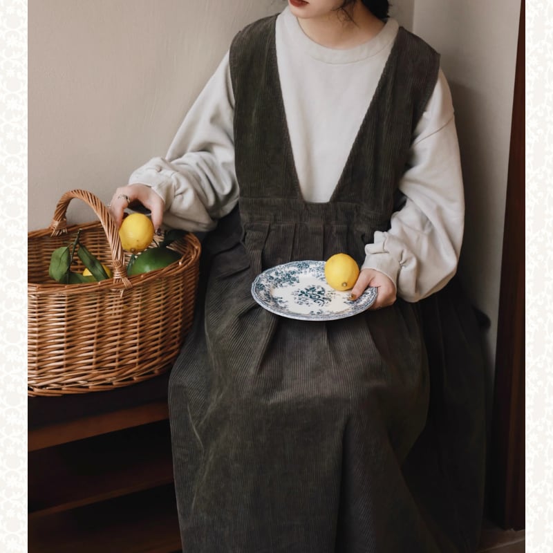 すっきりとしたVネックが大人可愛い、コーデュロイ素材のノースリーブワンピース。