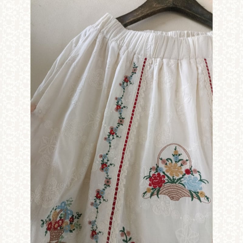 花柄プリントと刺繍レースが重なり合う、表情豊かなデザインスカート。