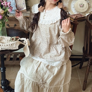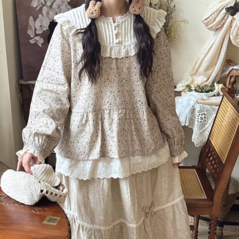 レーストリムと花柄が上品に映えるギャザーシャツ。