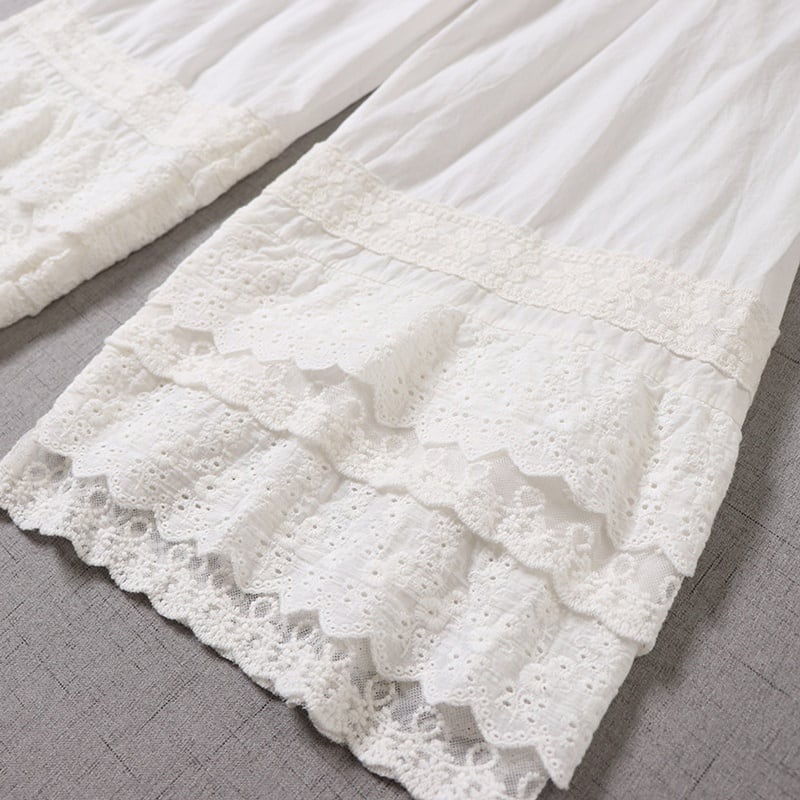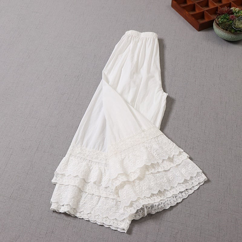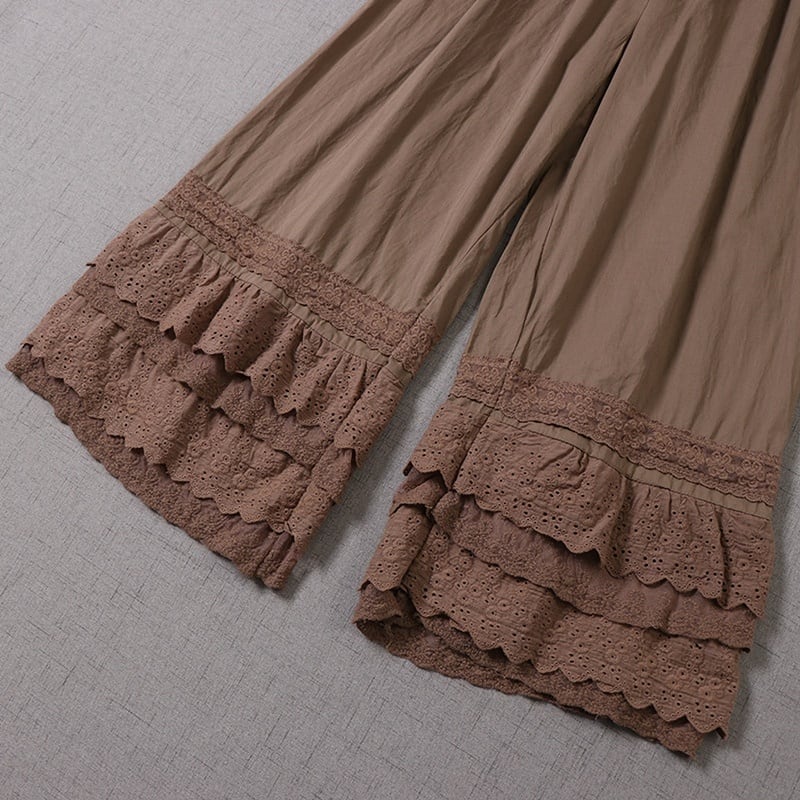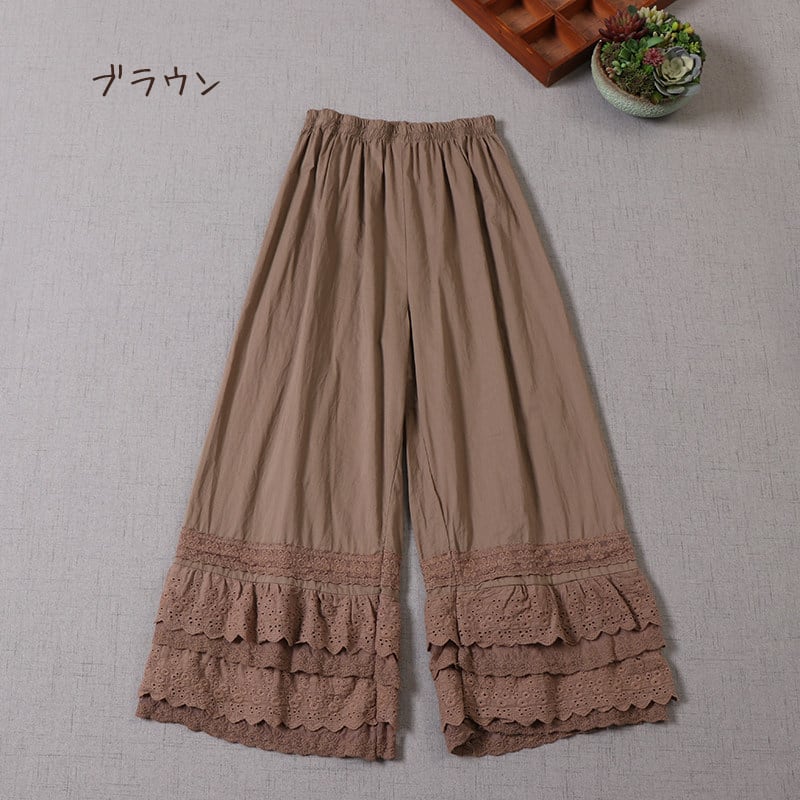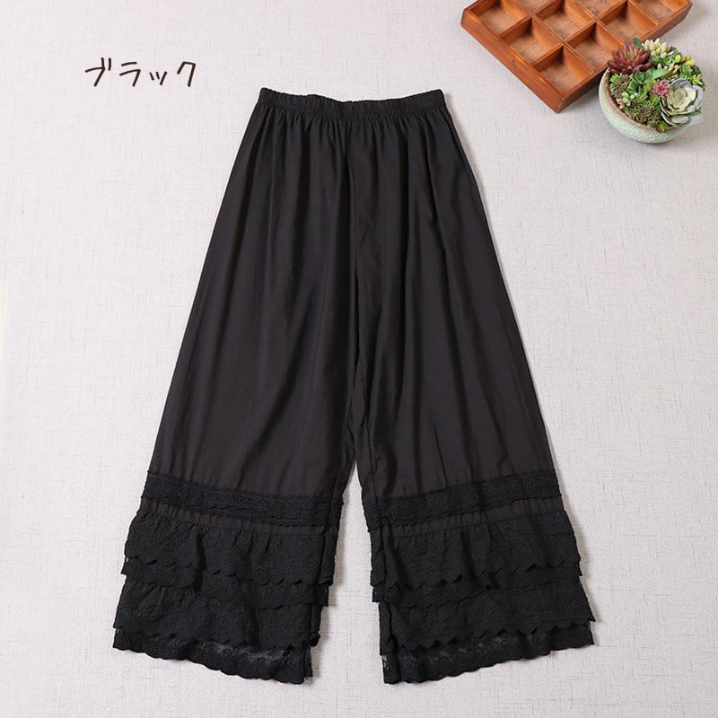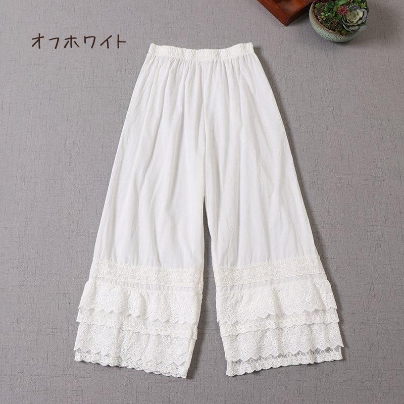 多層レースがやさしく重なる、表情豊かなワイドレッグペチパンツ。