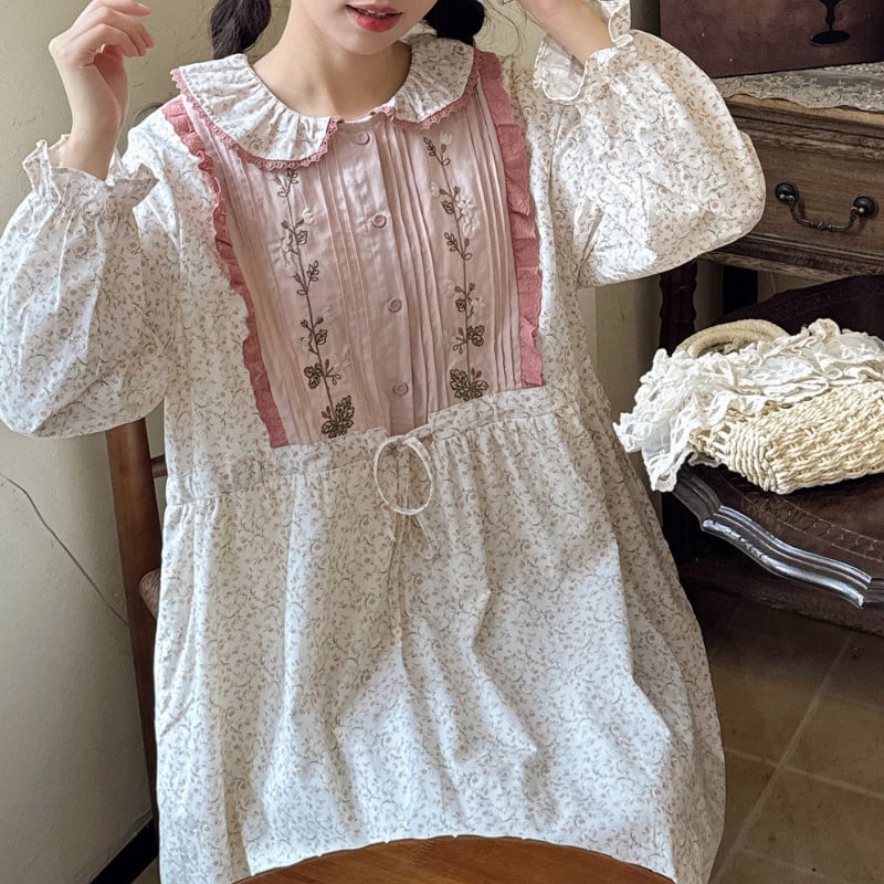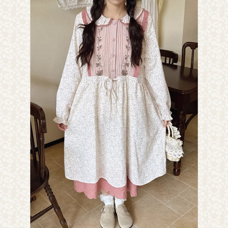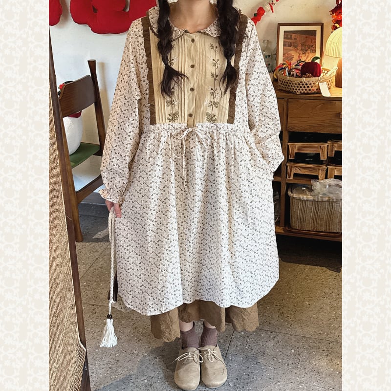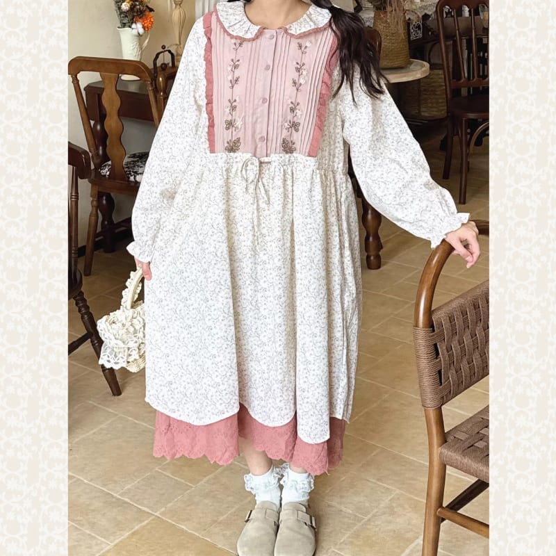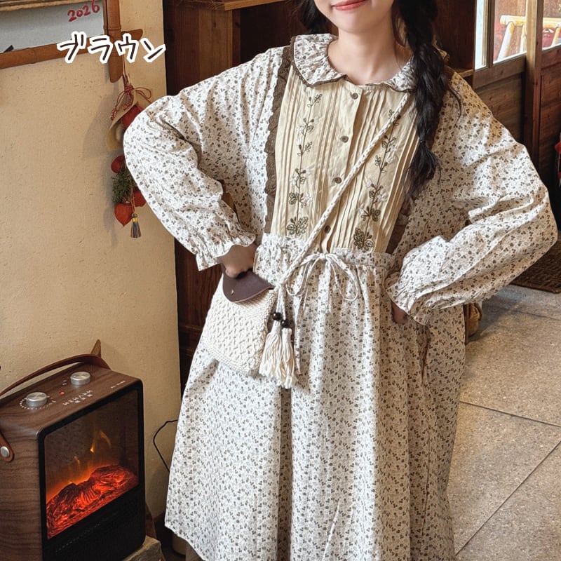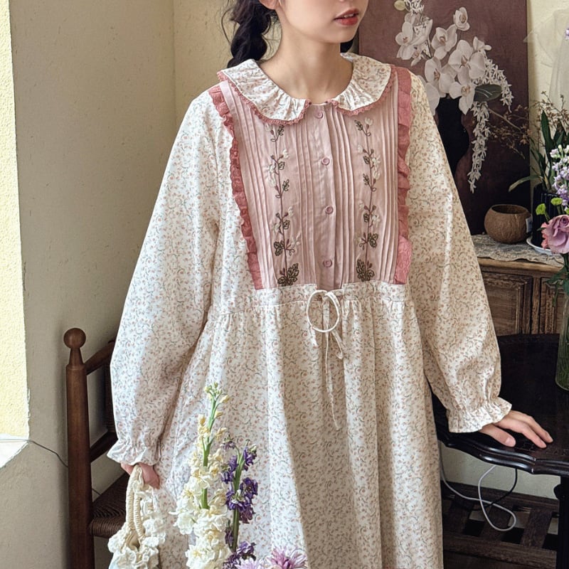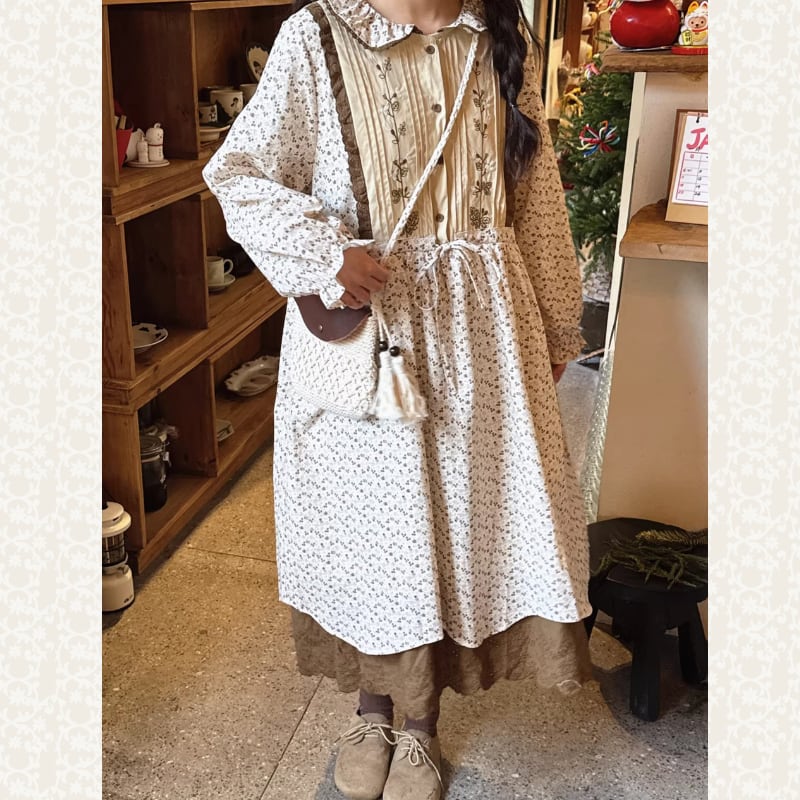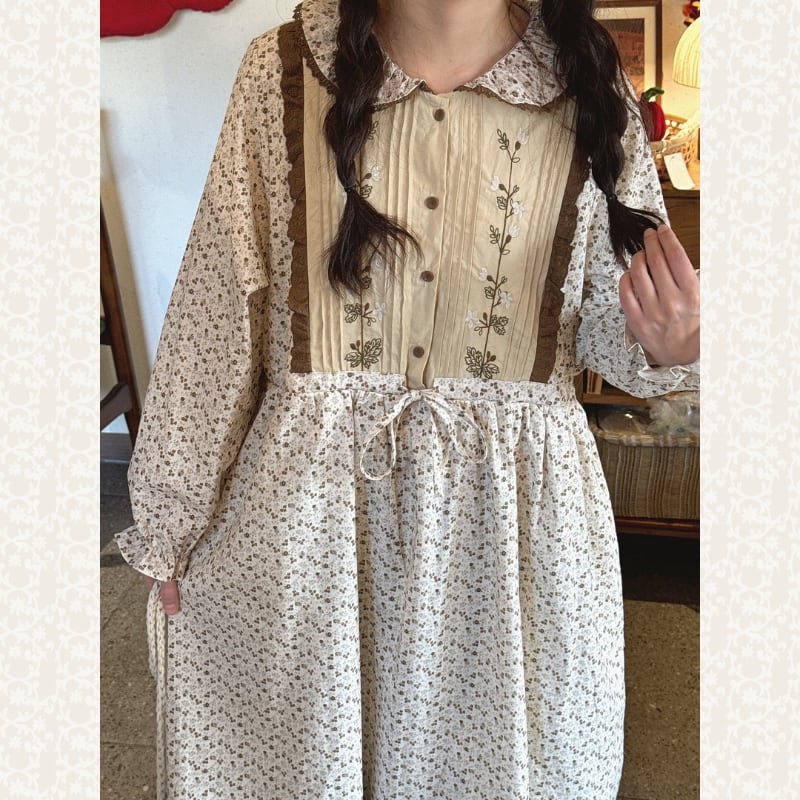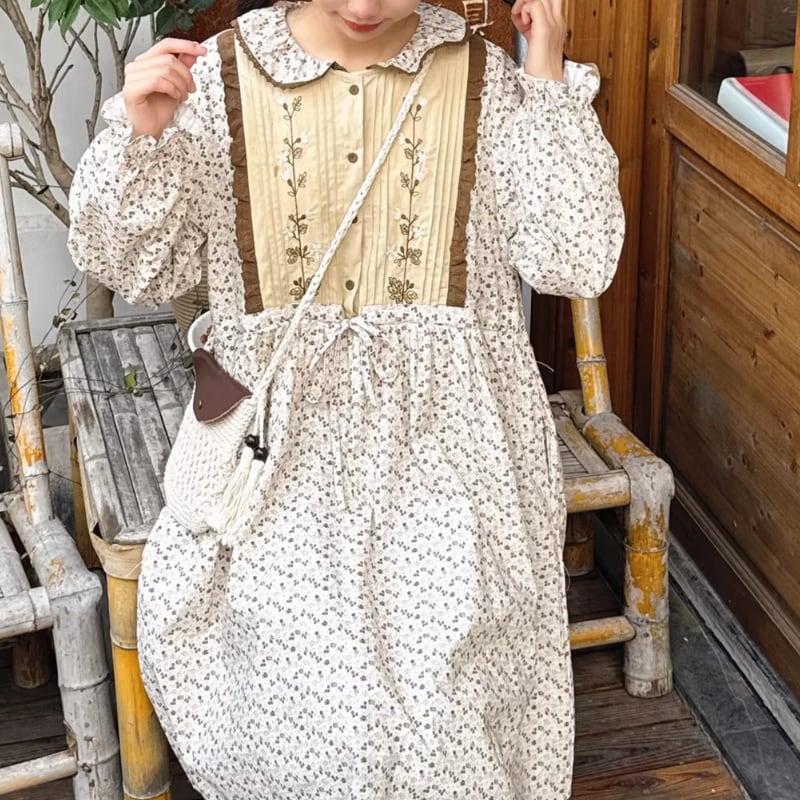レトロ刺繍パッチワーク裾レースワンピース W1701