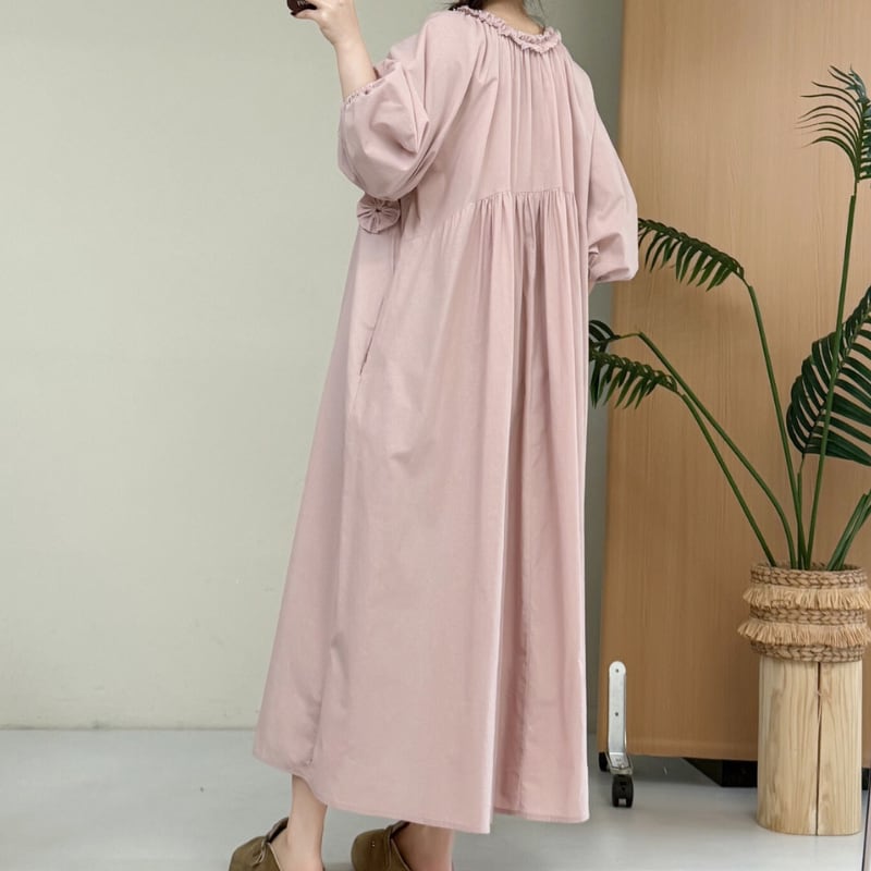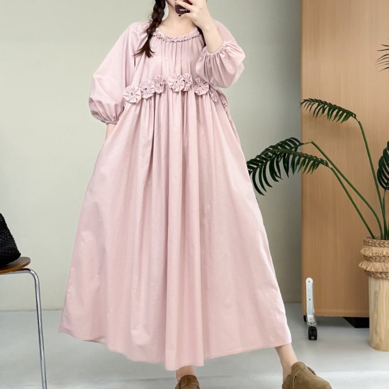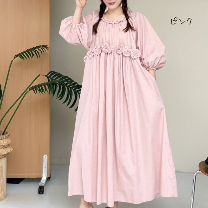 パフスリーブウエストフラワーデザインワンピース W1704