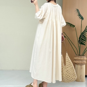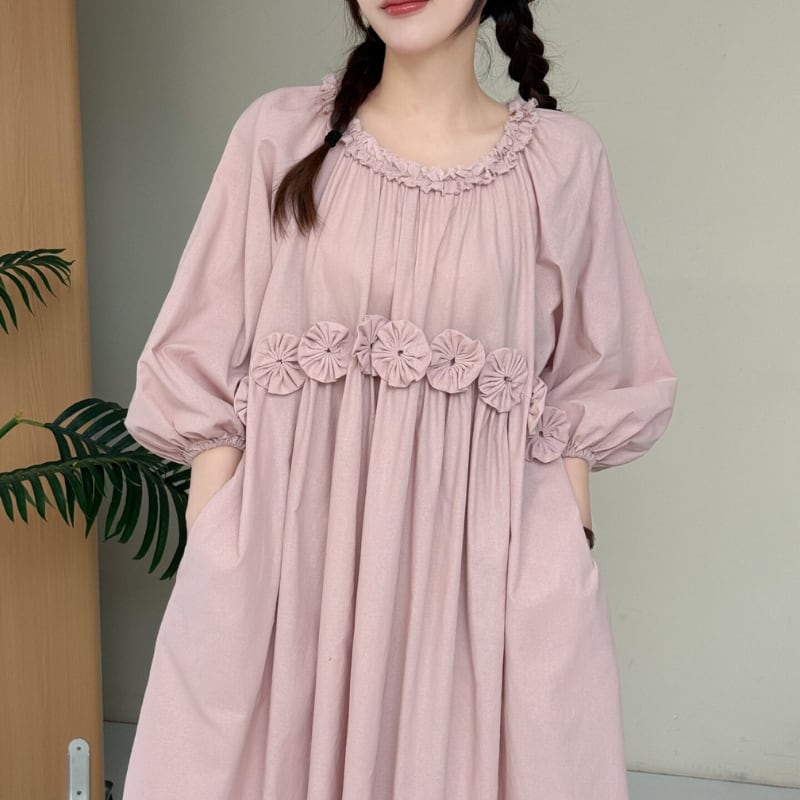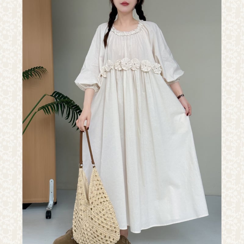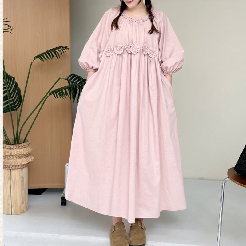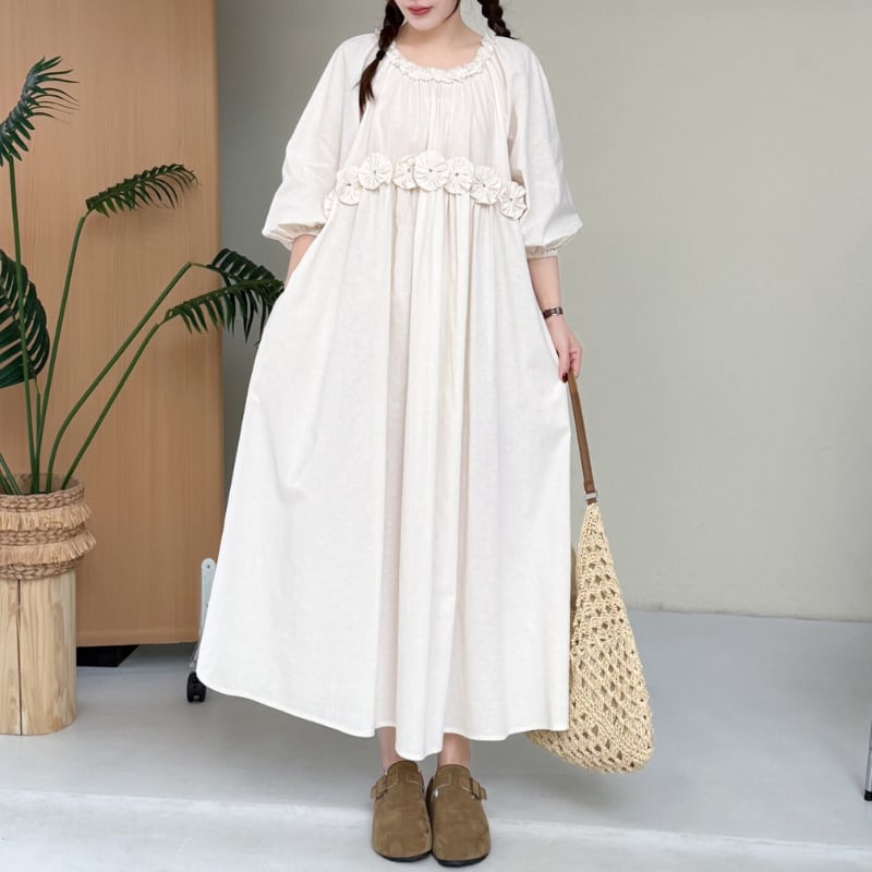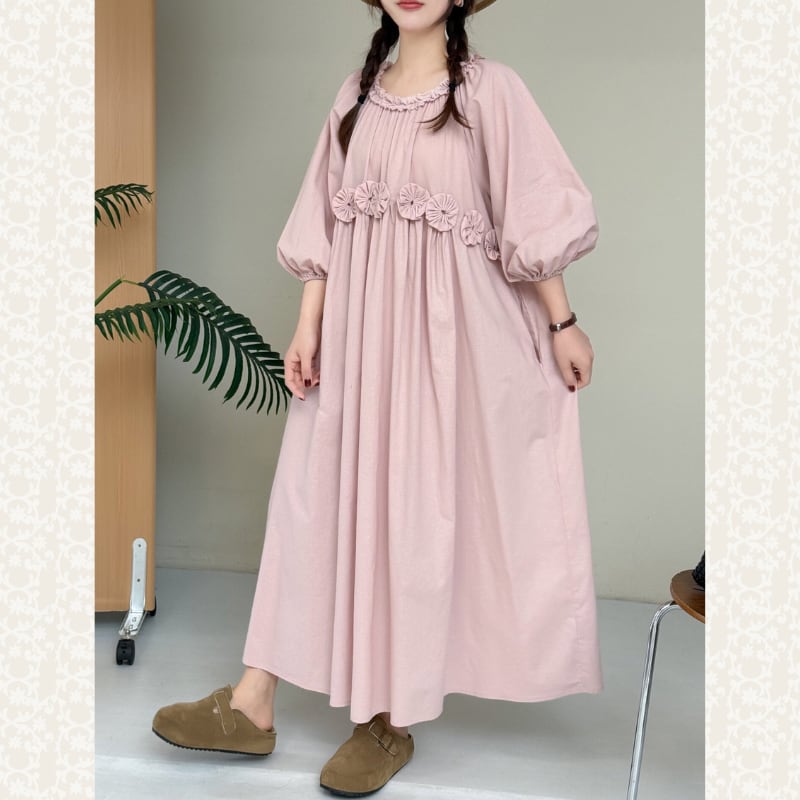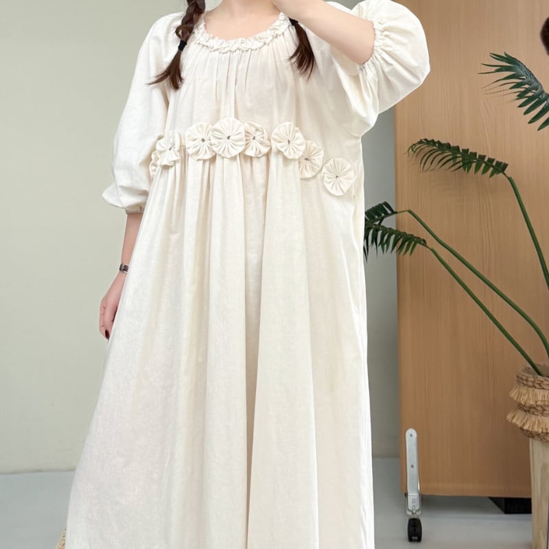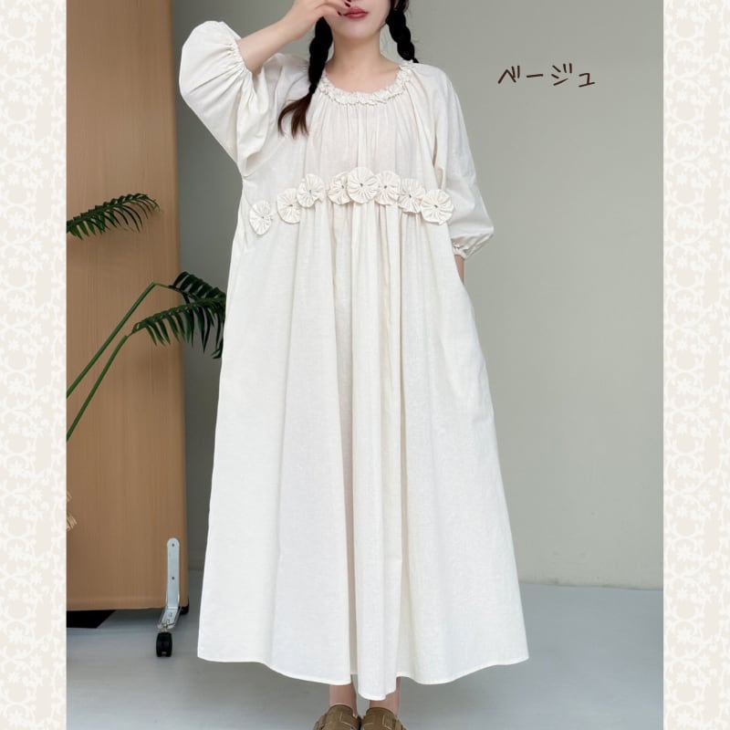 ふんわりとしたパフスリーブと、ウエストのフラワーデザインが印象的なワンピース。
