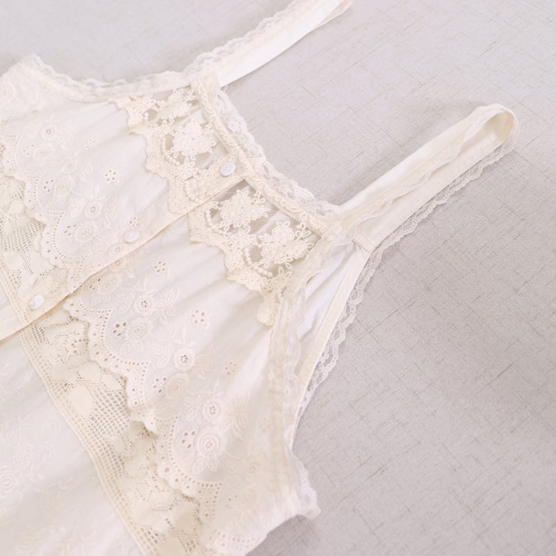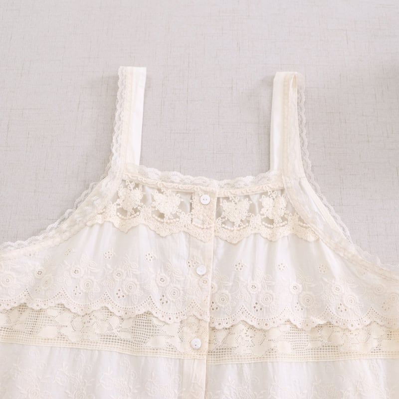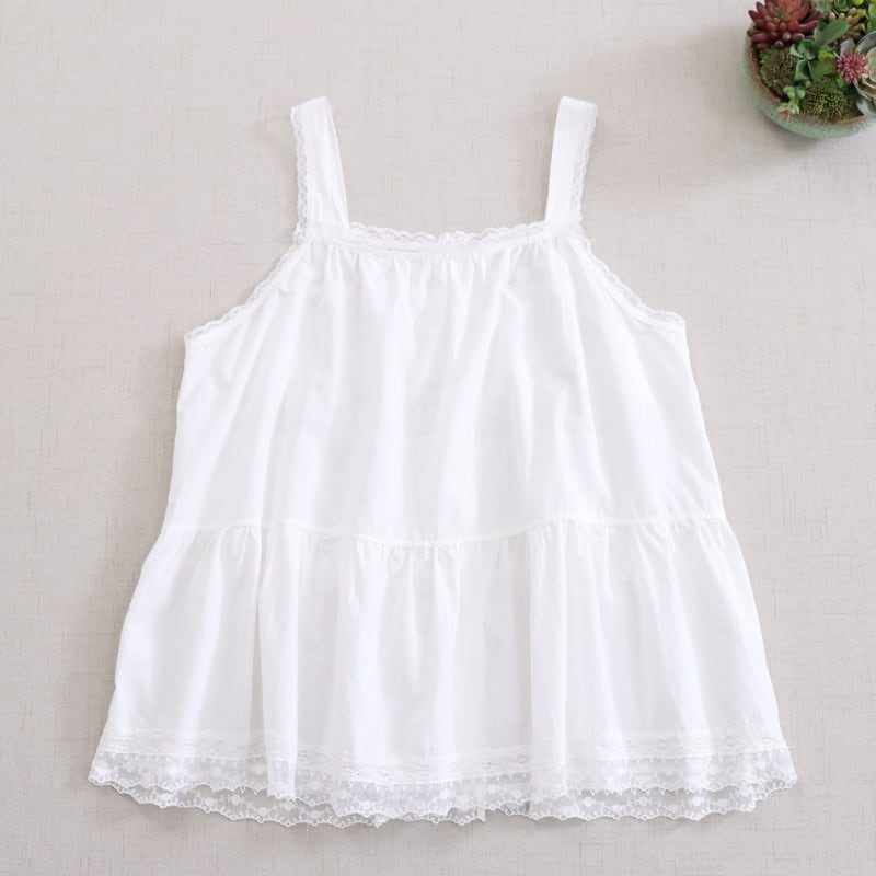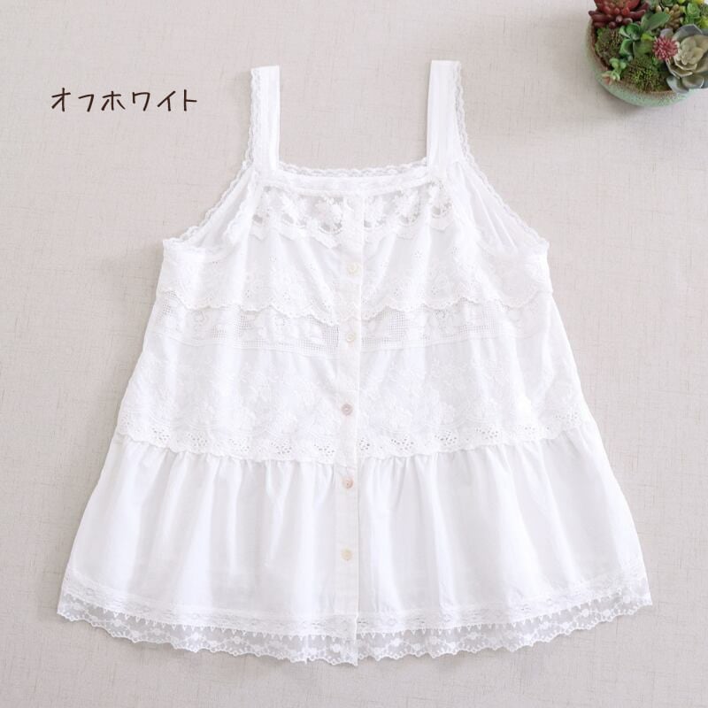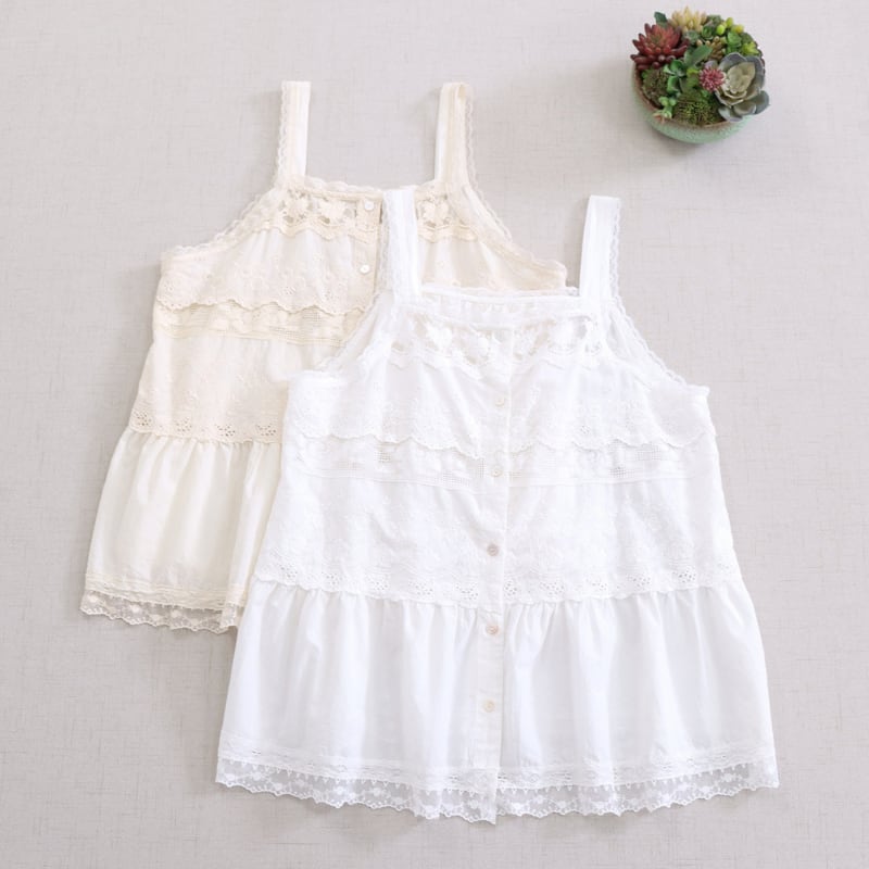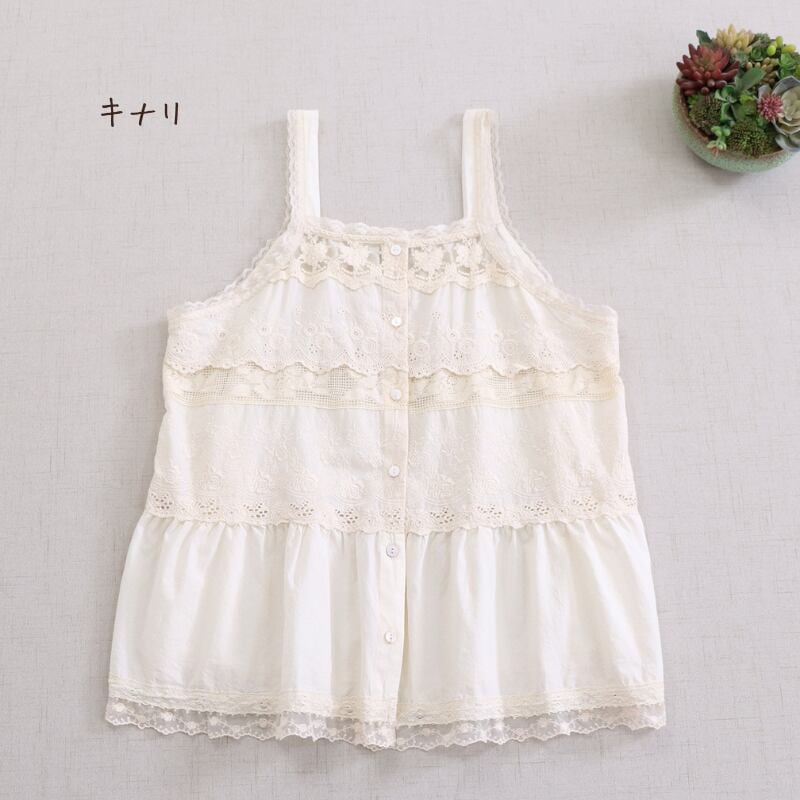レースと刺繍の切り替えがアクセントになるキャミソールです。