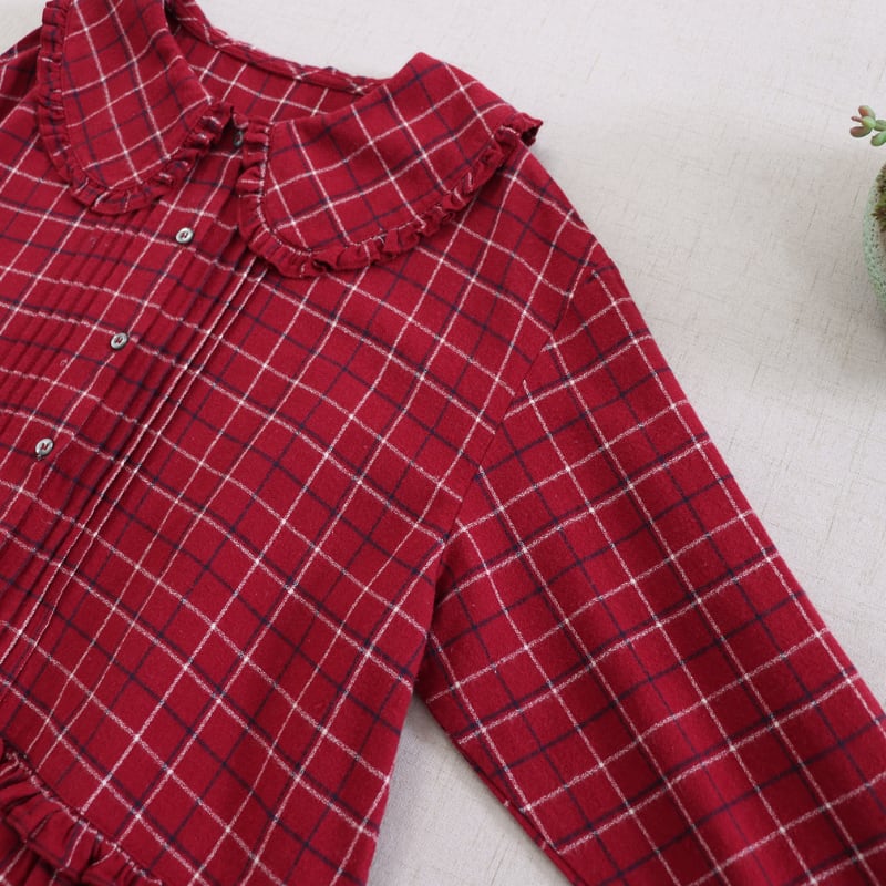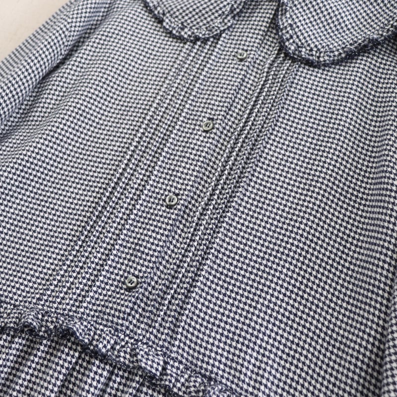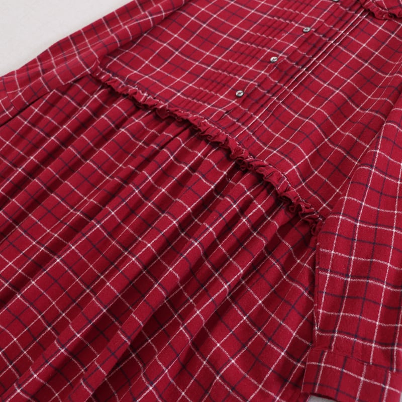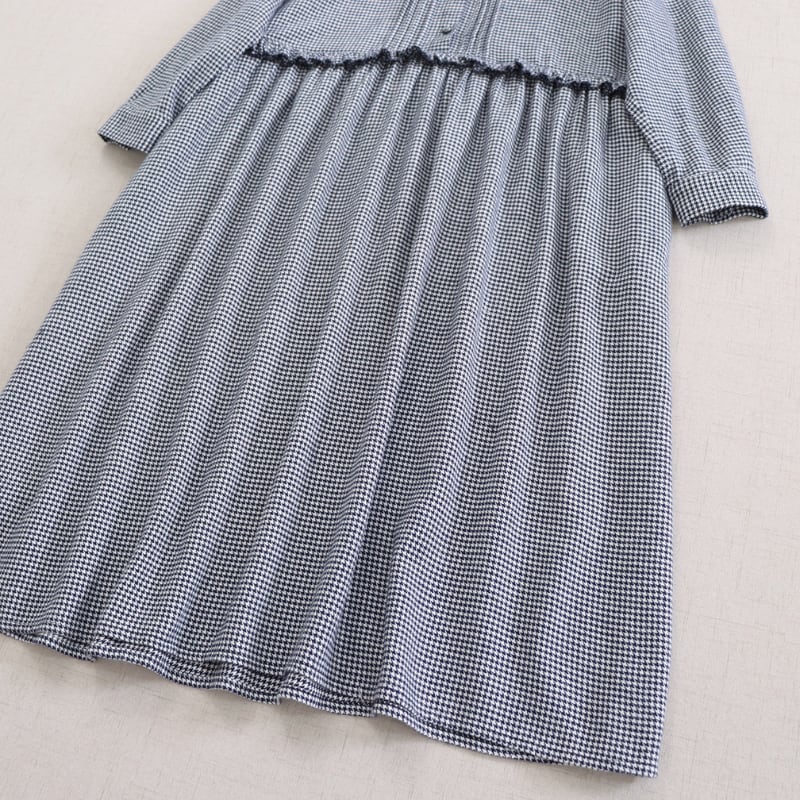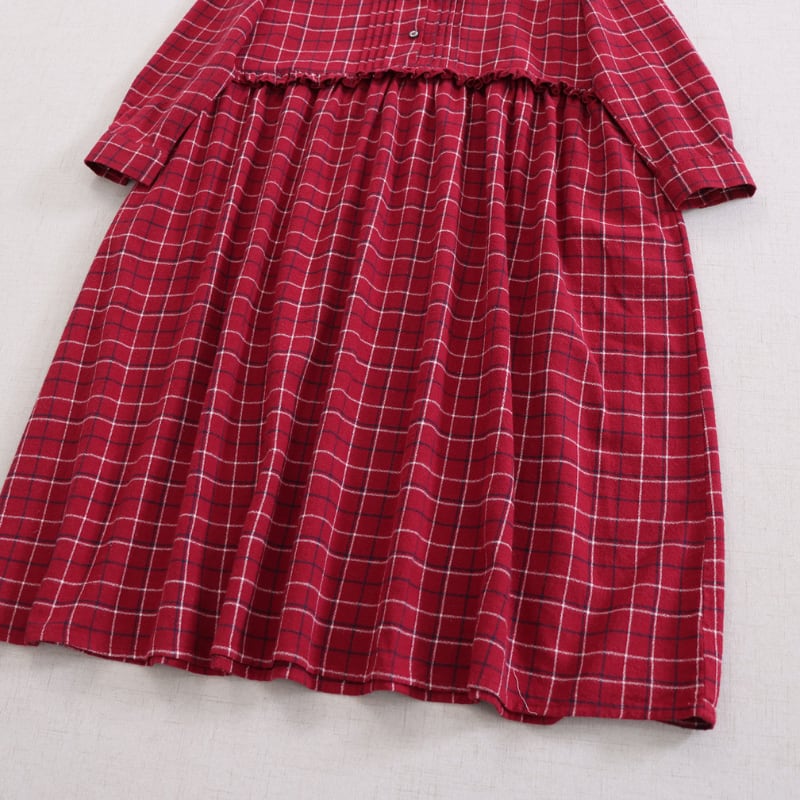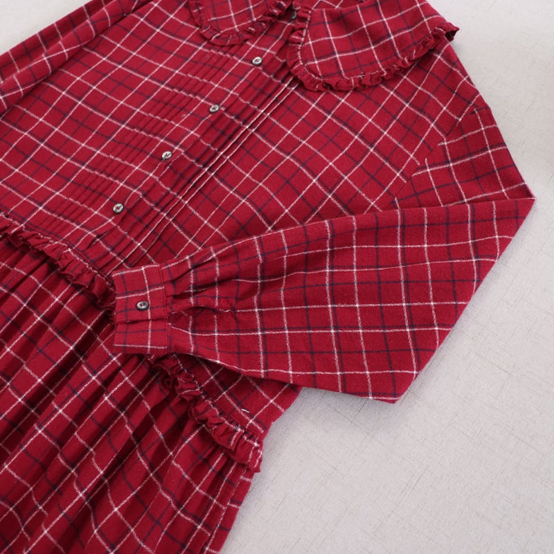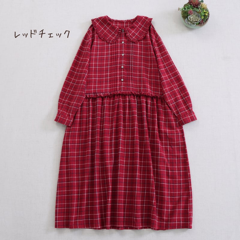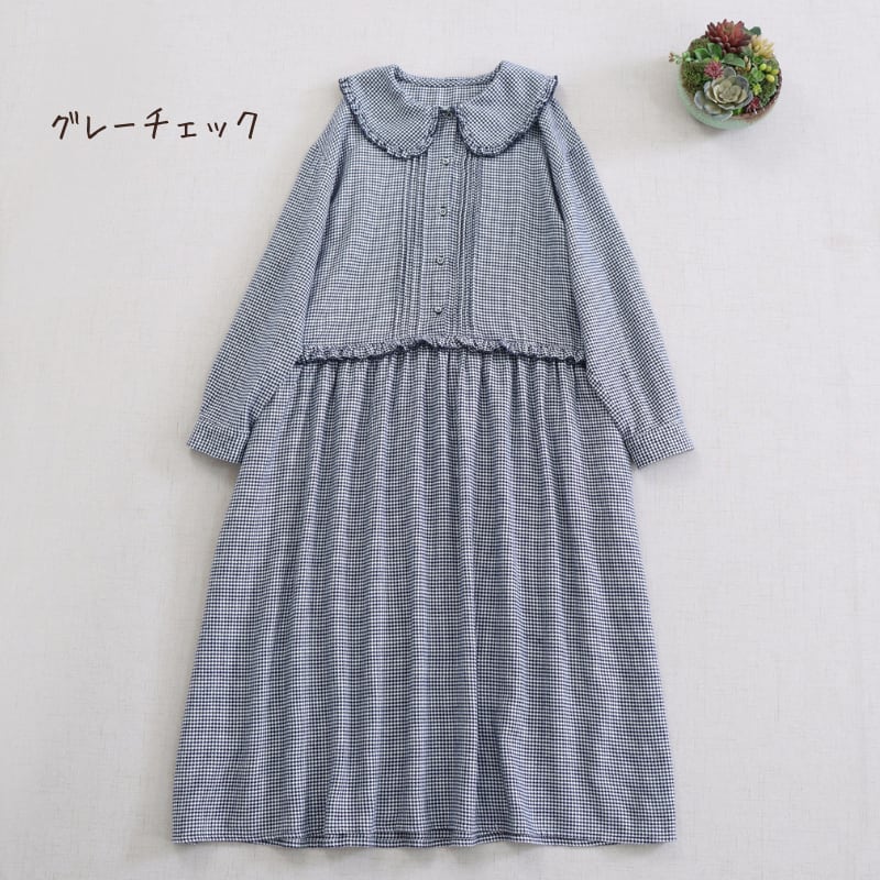 フリルをあしらった丸襟と細やかなチェック柄が、やさしい雰囲気を添えるワンピースです。