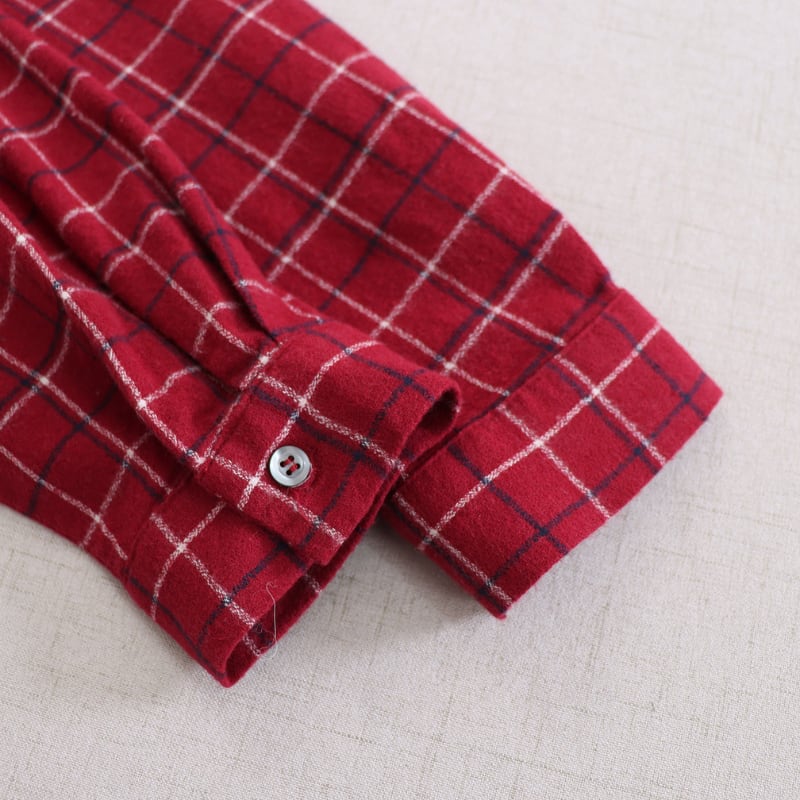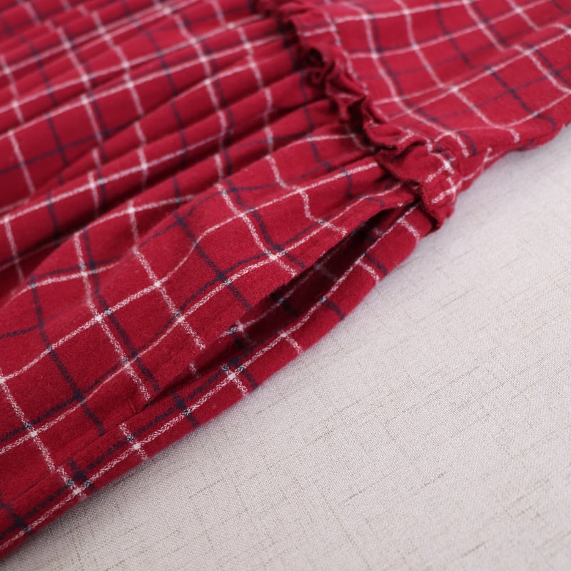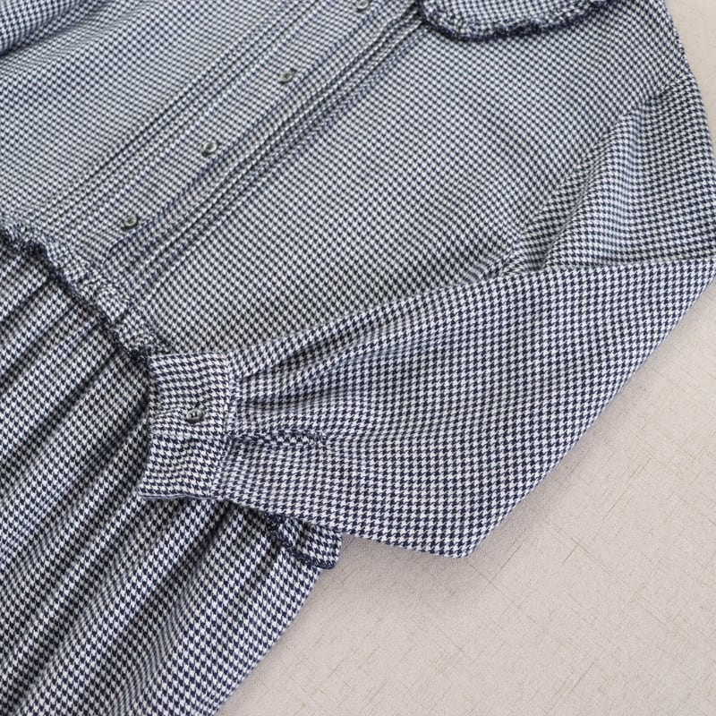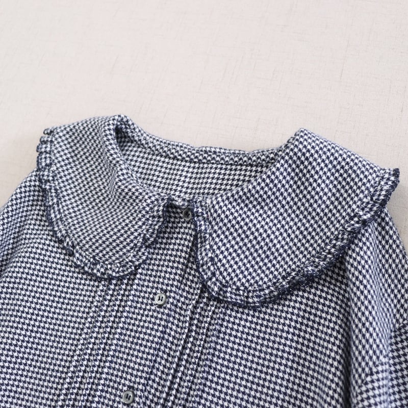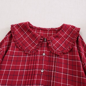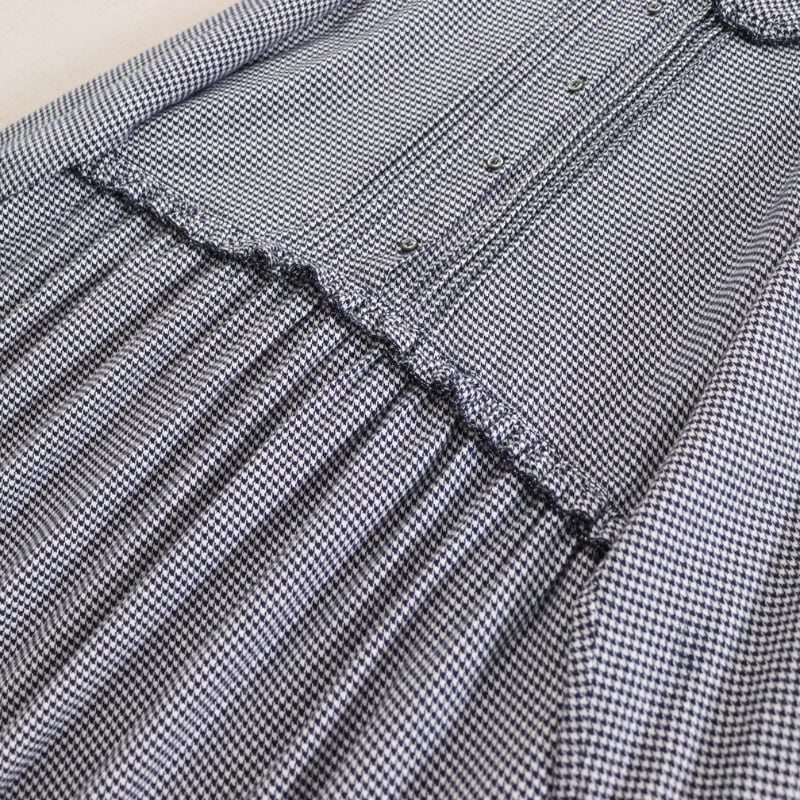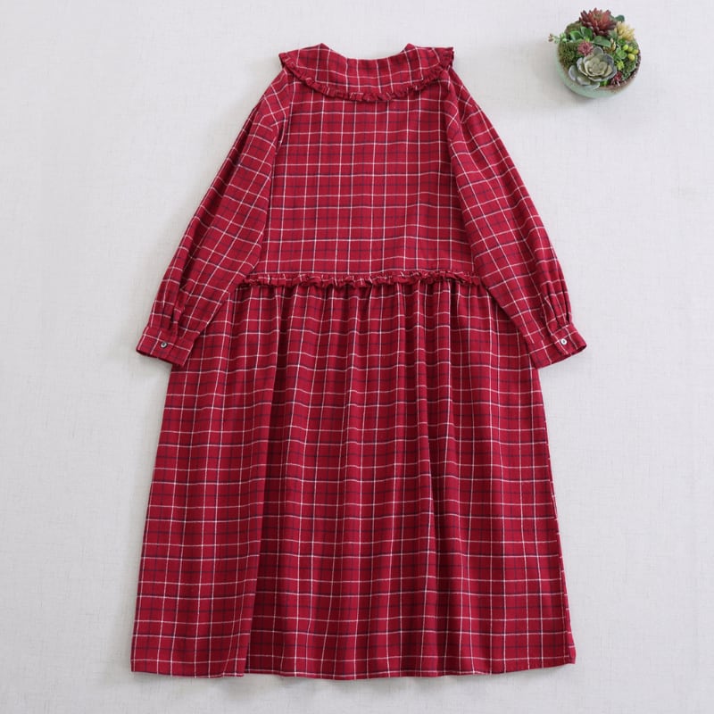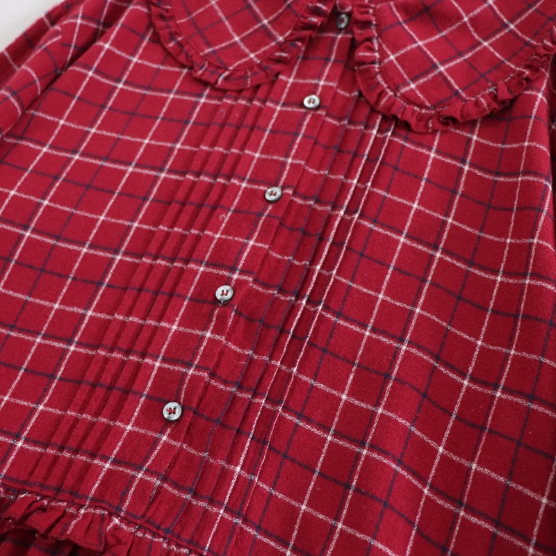フリルをあしらった丸襟と細やかなチェック柄が、やさしい雰囲気を添えるワンピースです。