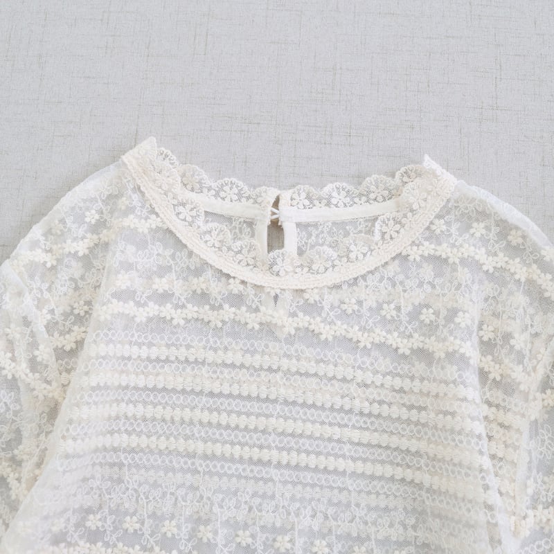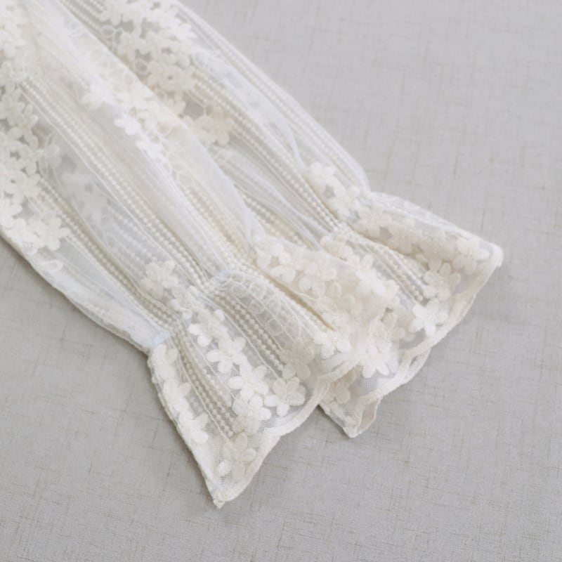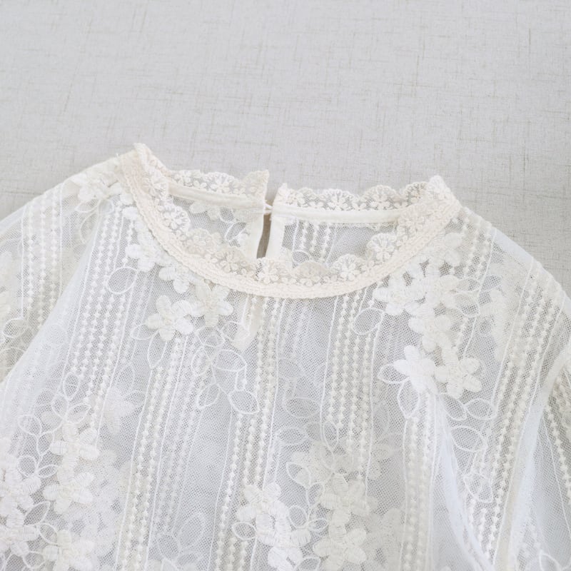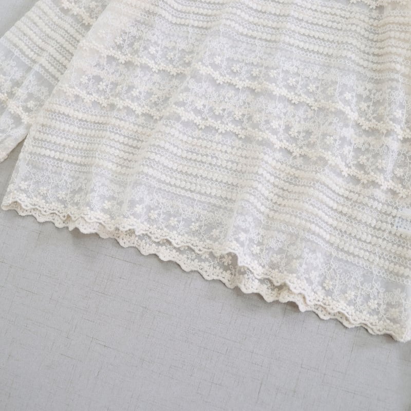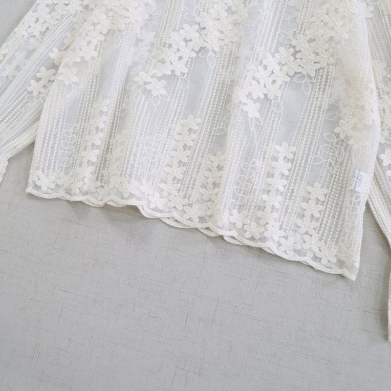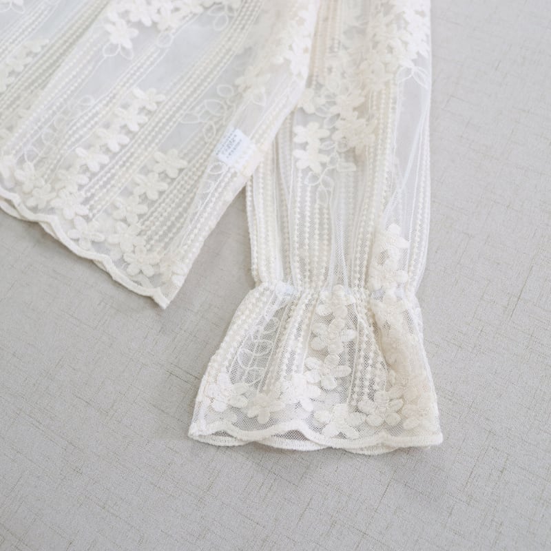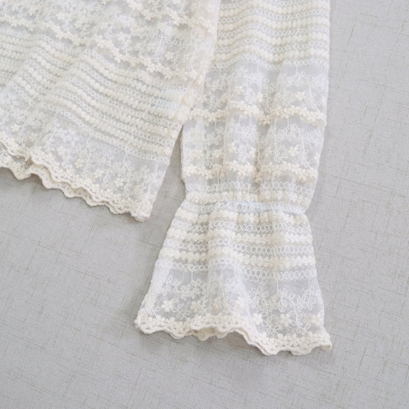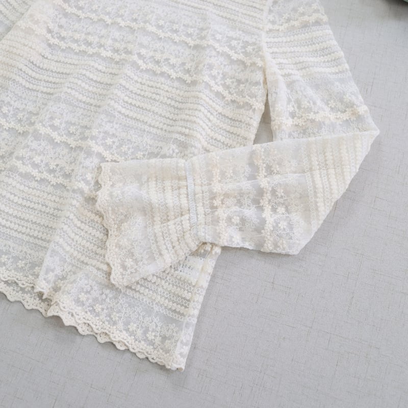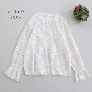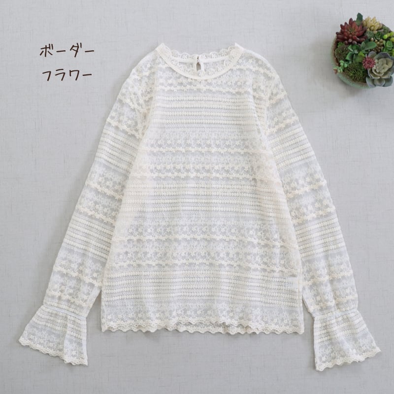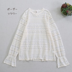 レースの縦・横切り替えがアクセントになる長袖シアーブラウスです。