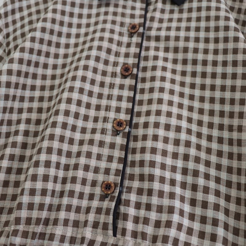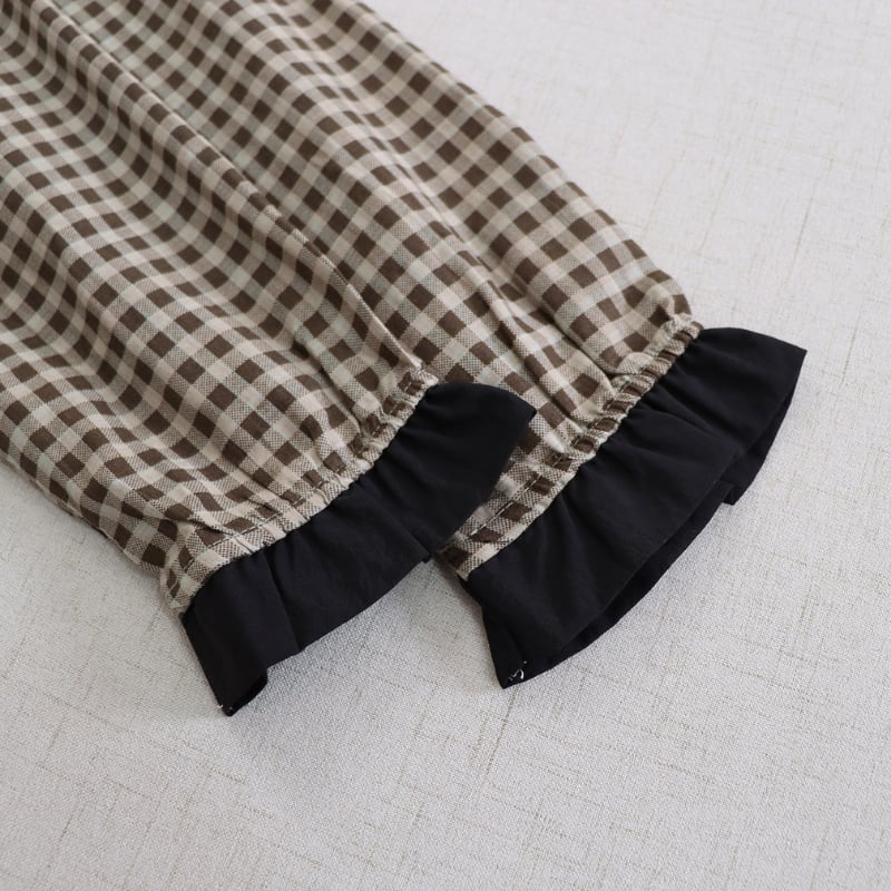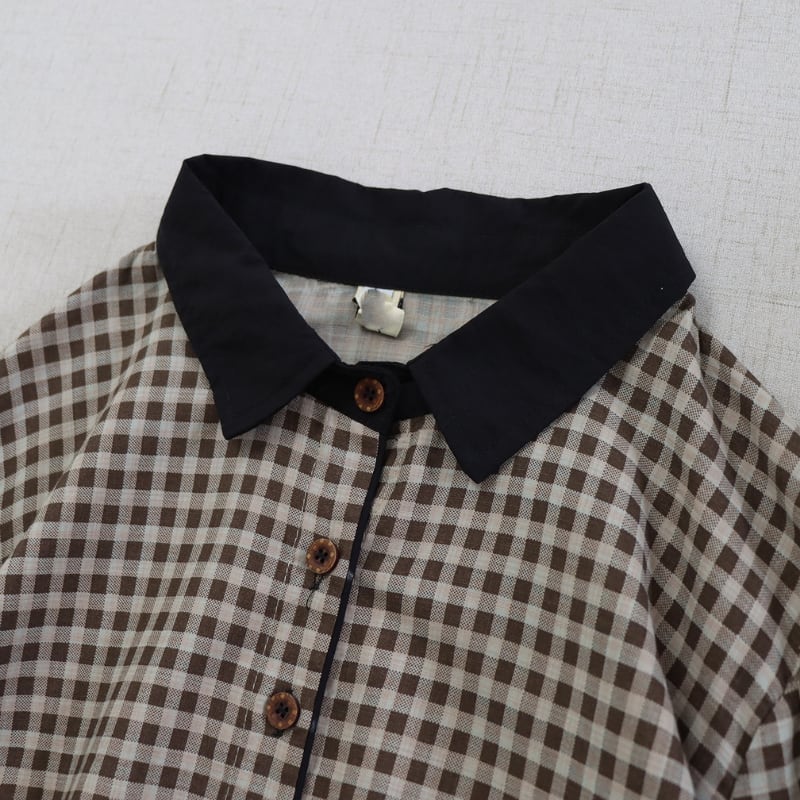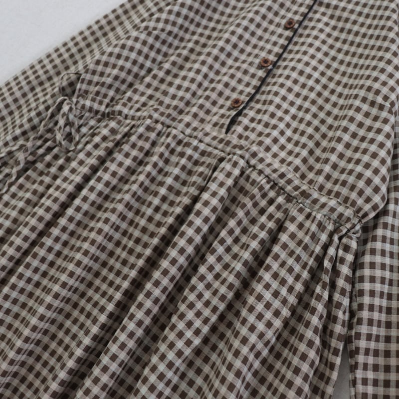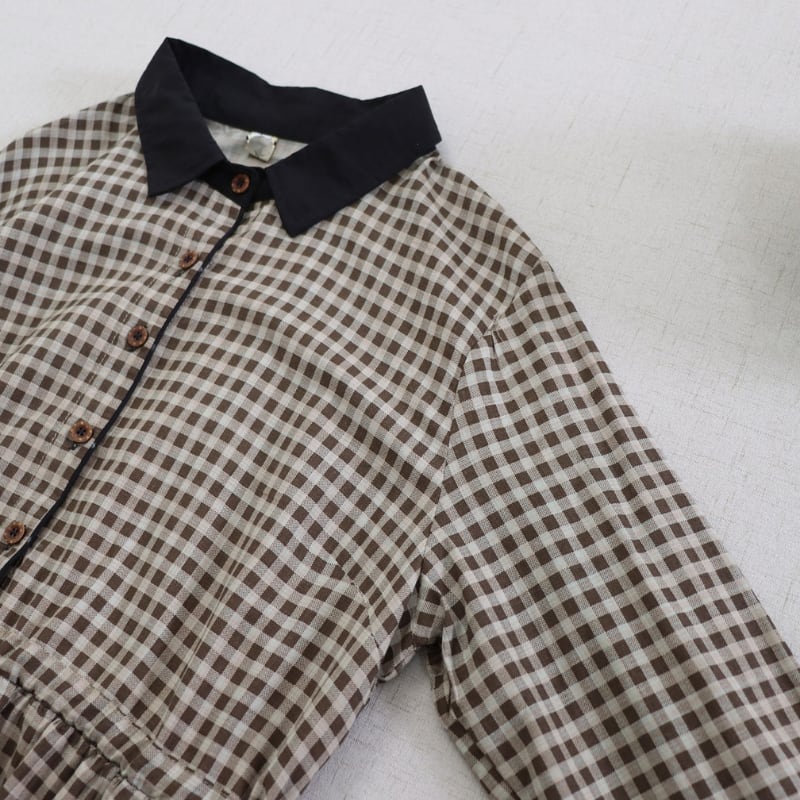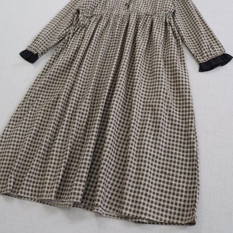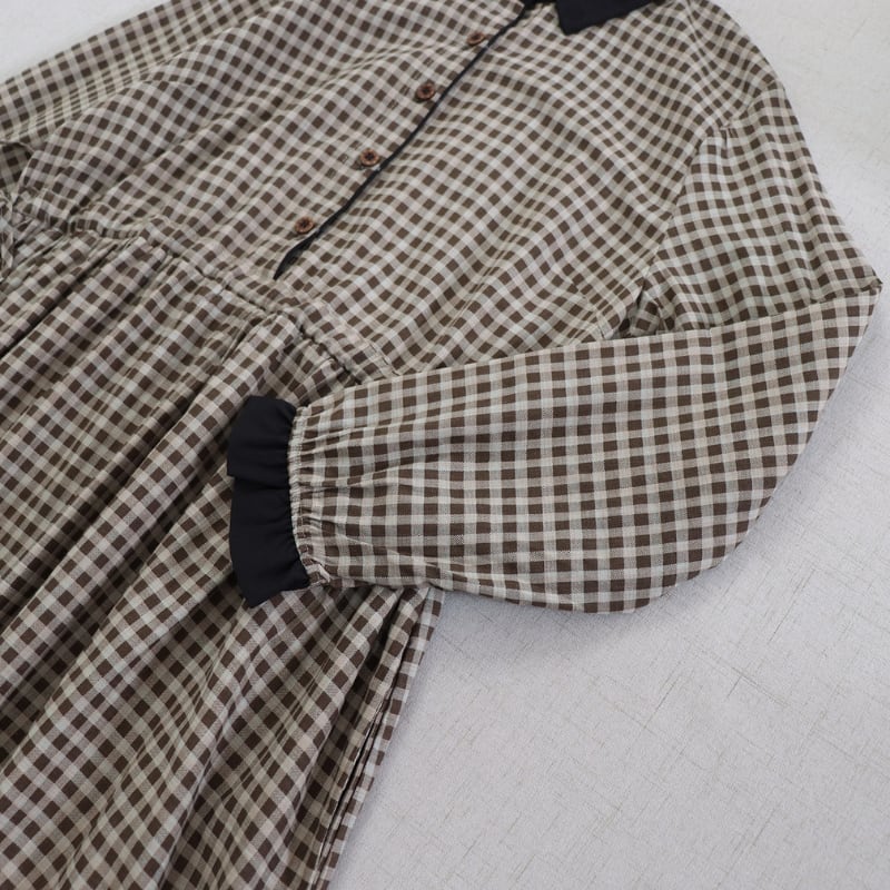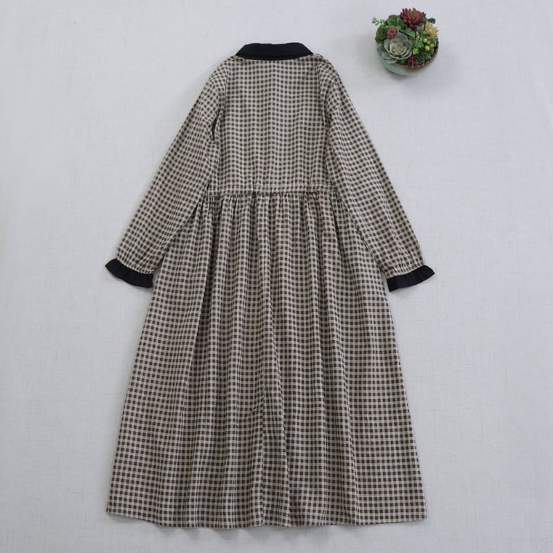 落ち着いたチェック柄に黒衿とカフスを合わせたデザインが、やさしい存在感を見せるロングワンピースです。