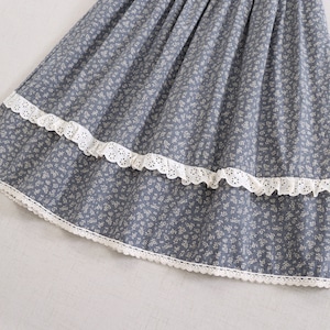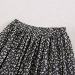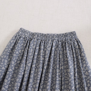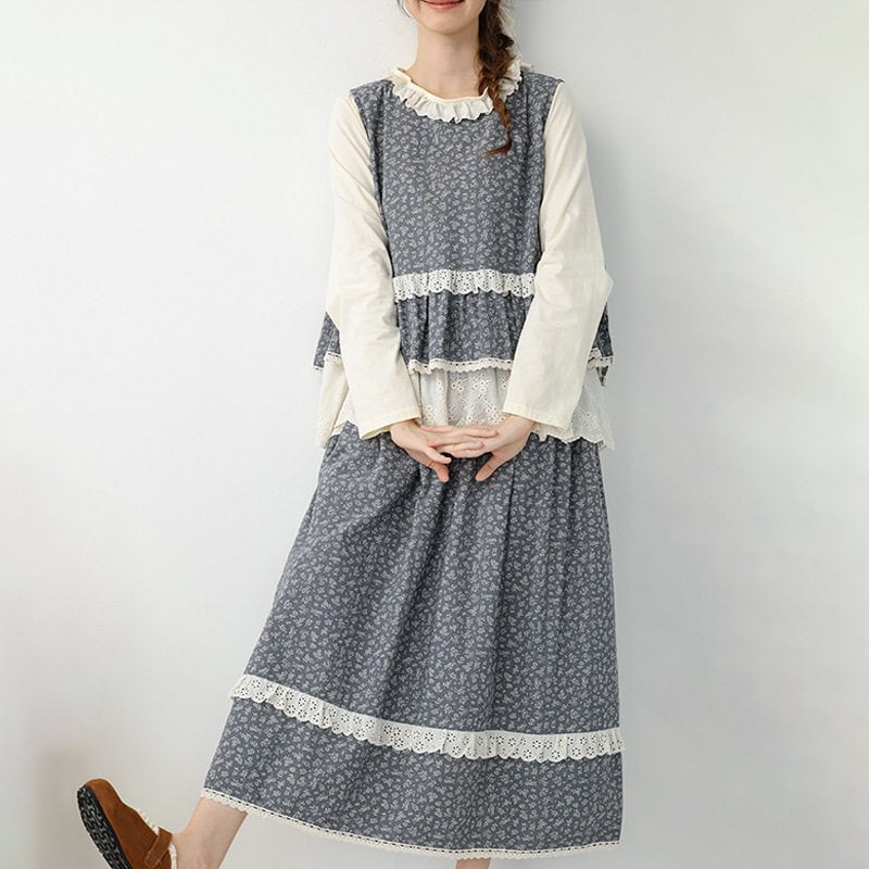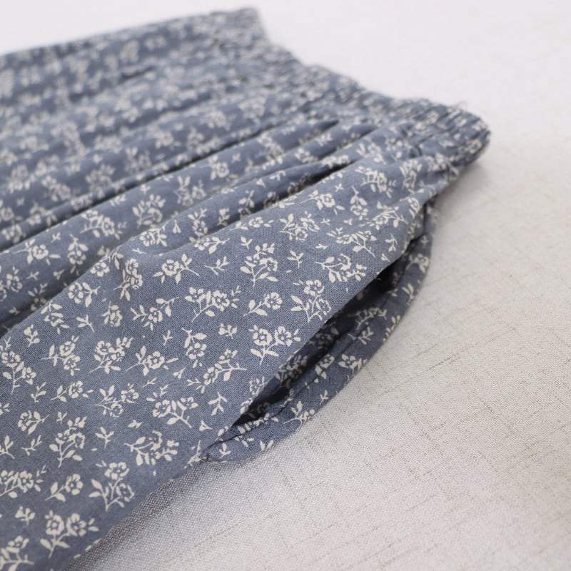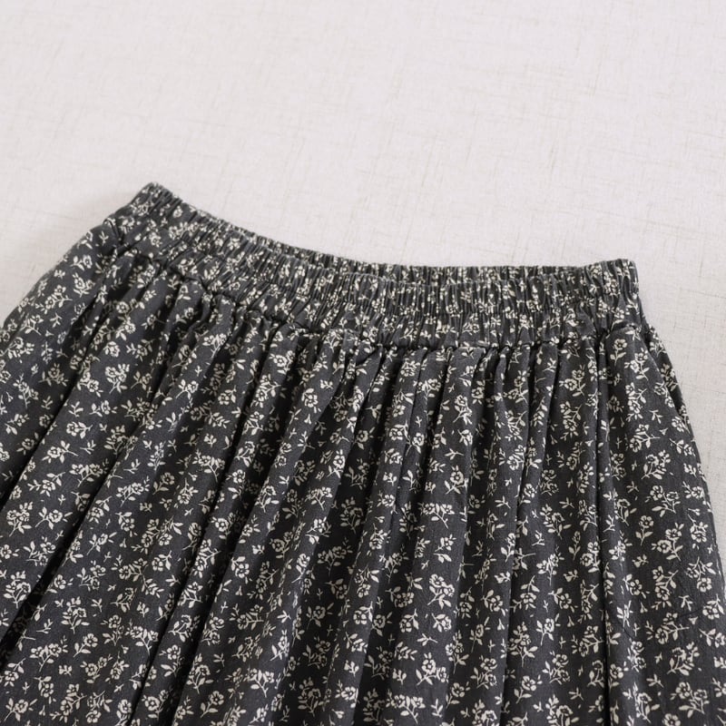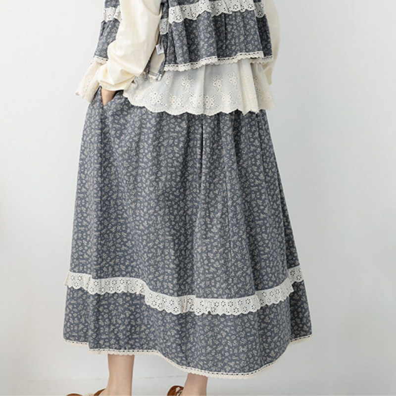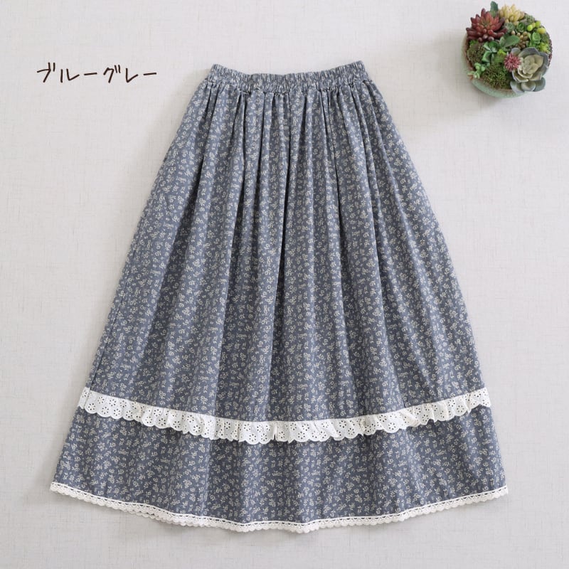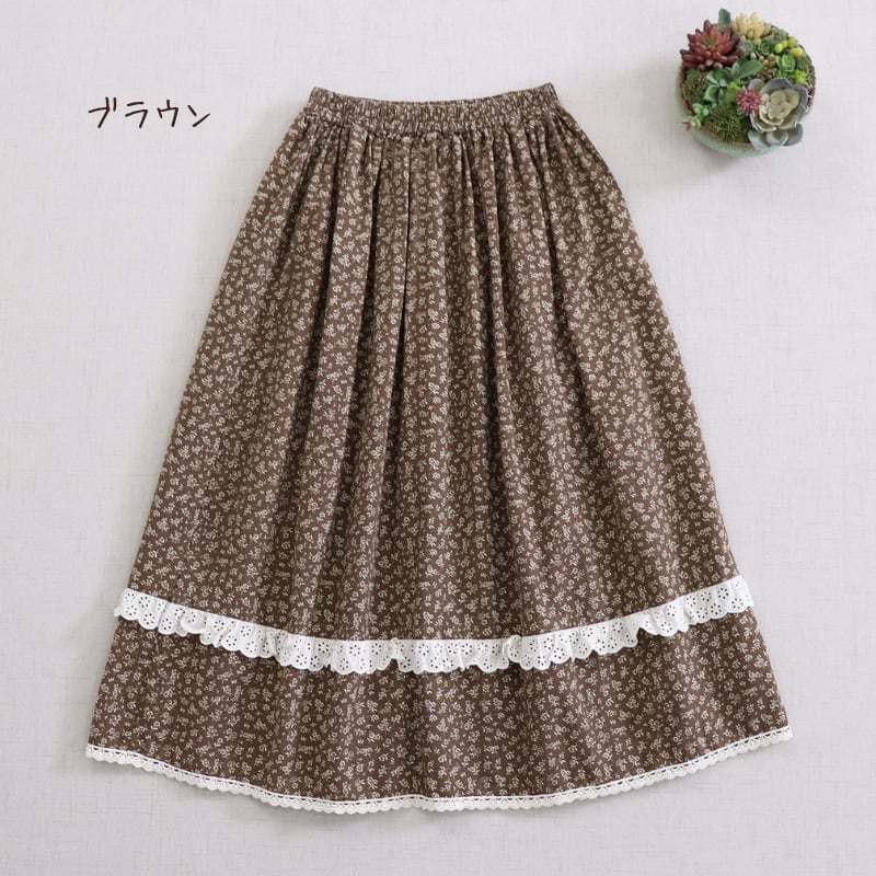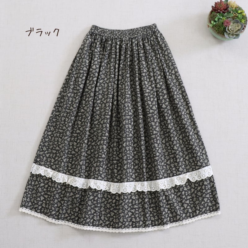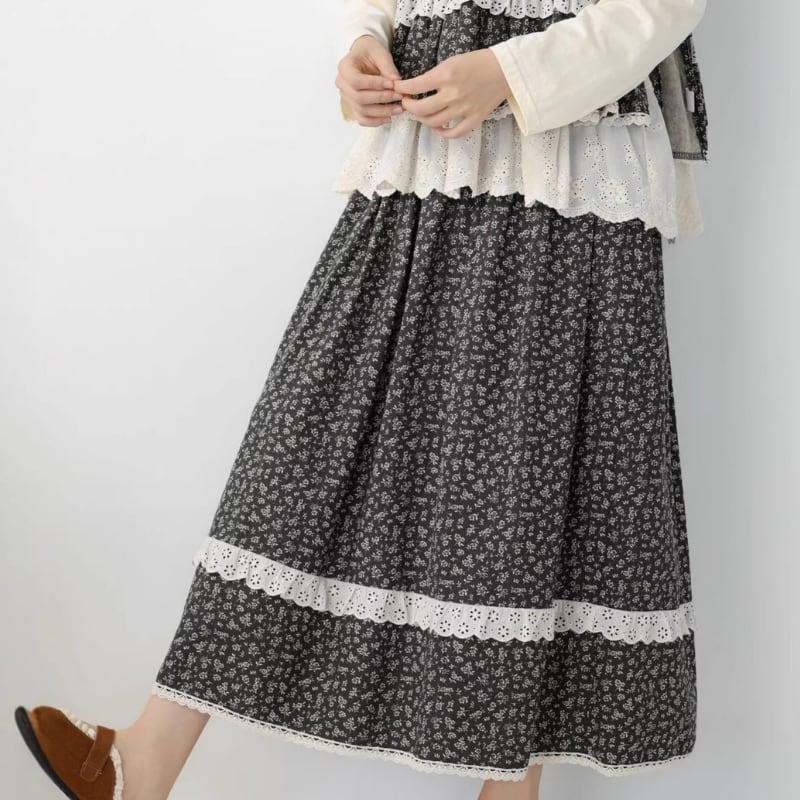 小花柄にレース裾を合わせたデザインが、やさしい印象を添えるロングスカートです。