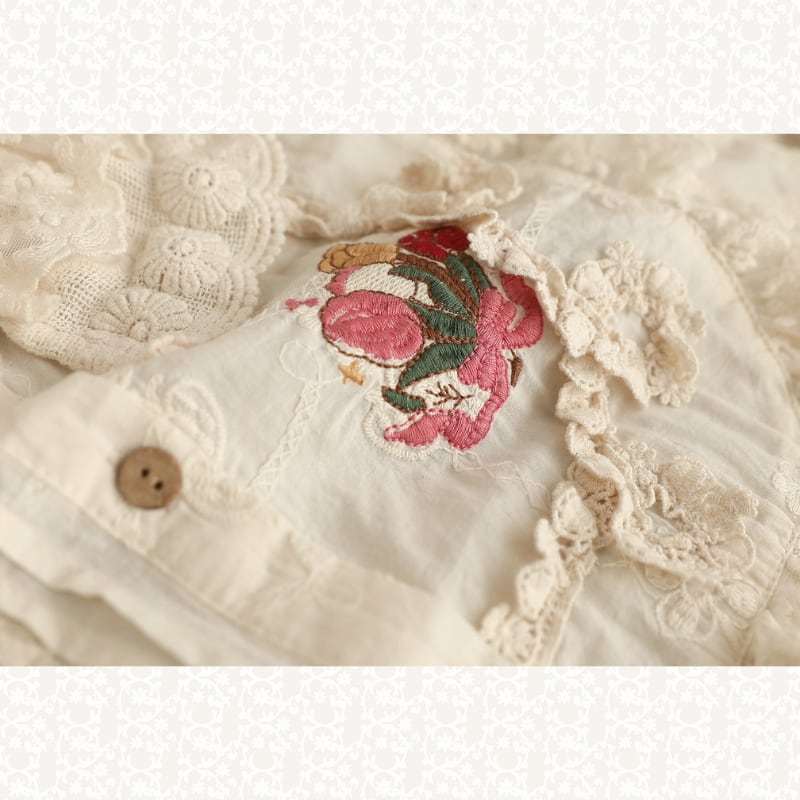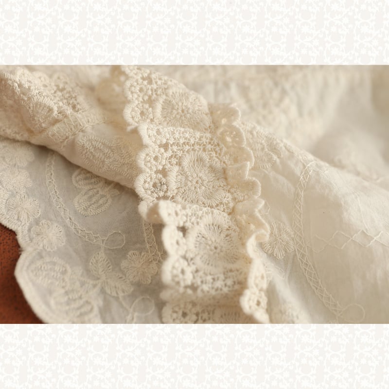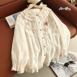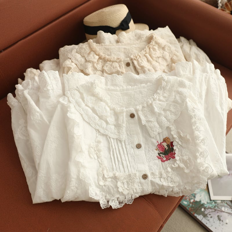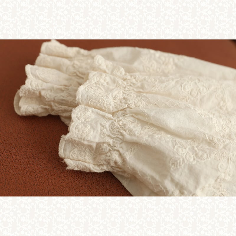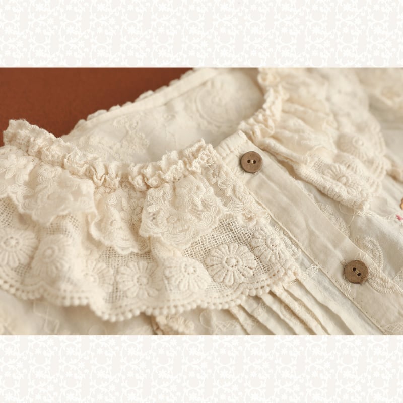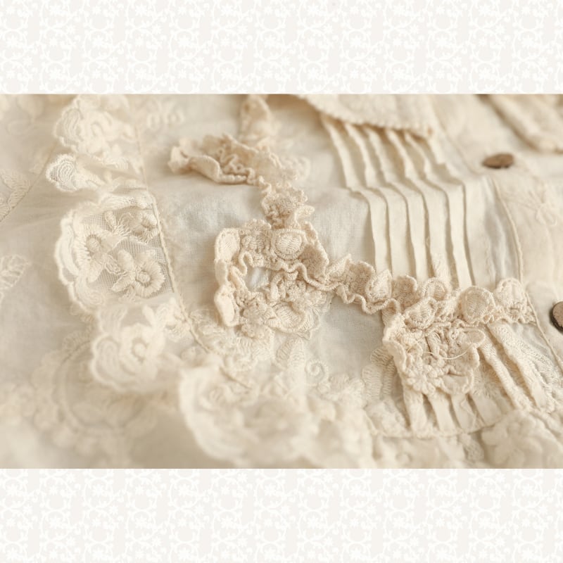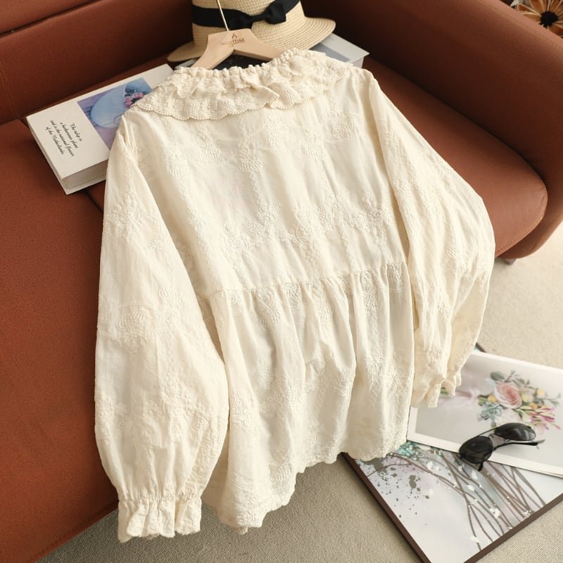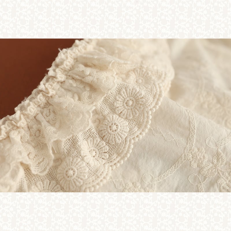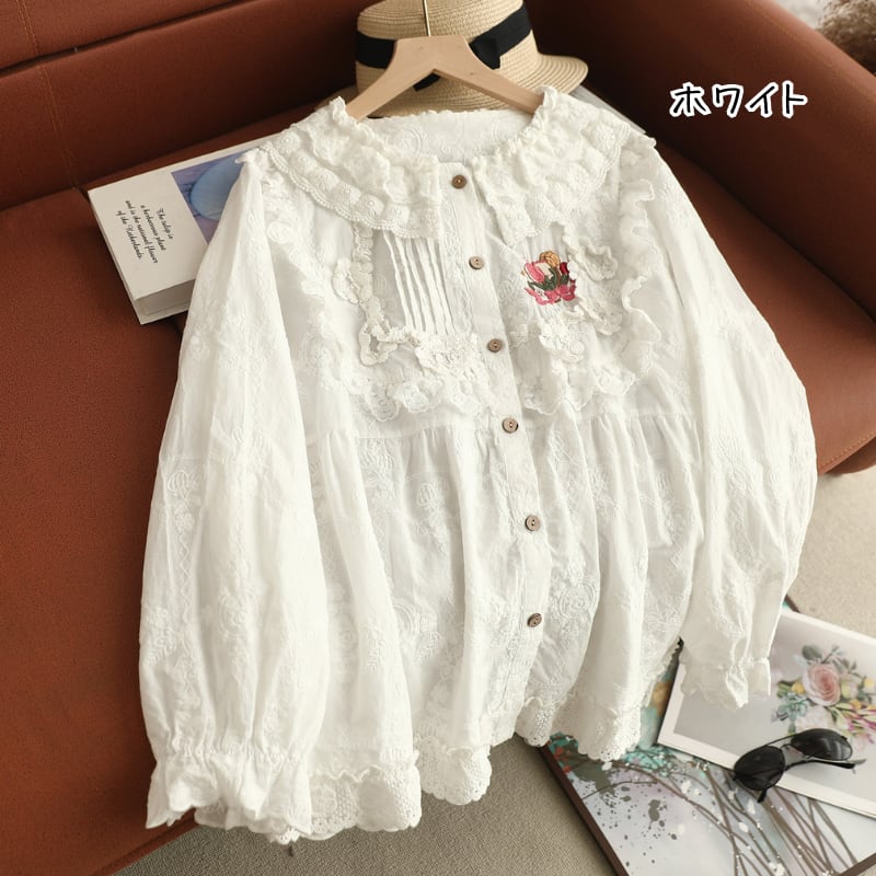 ダブルレースカラーにポイント刺繍をあしらった、華やかな印象のブラウス。