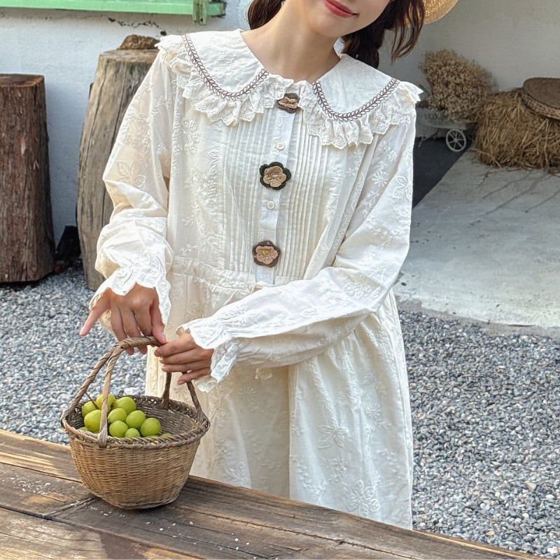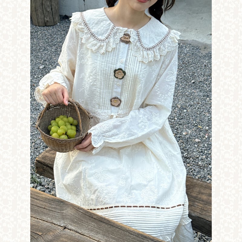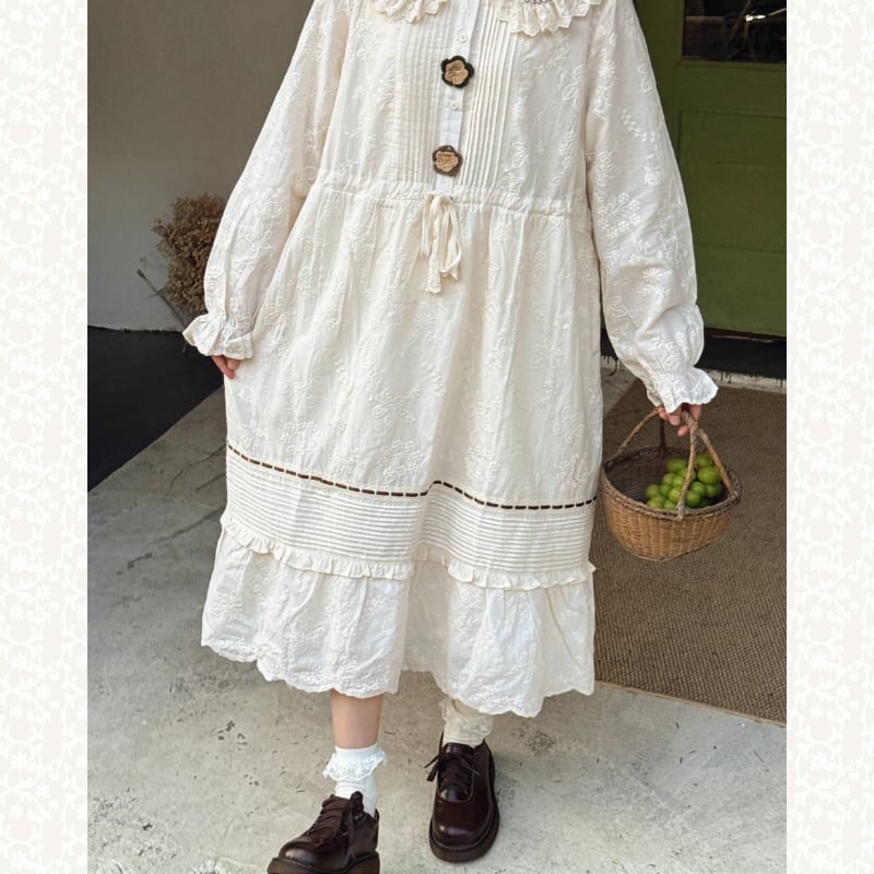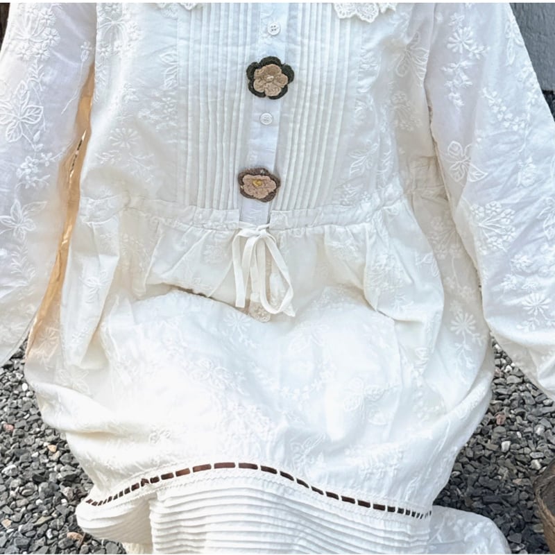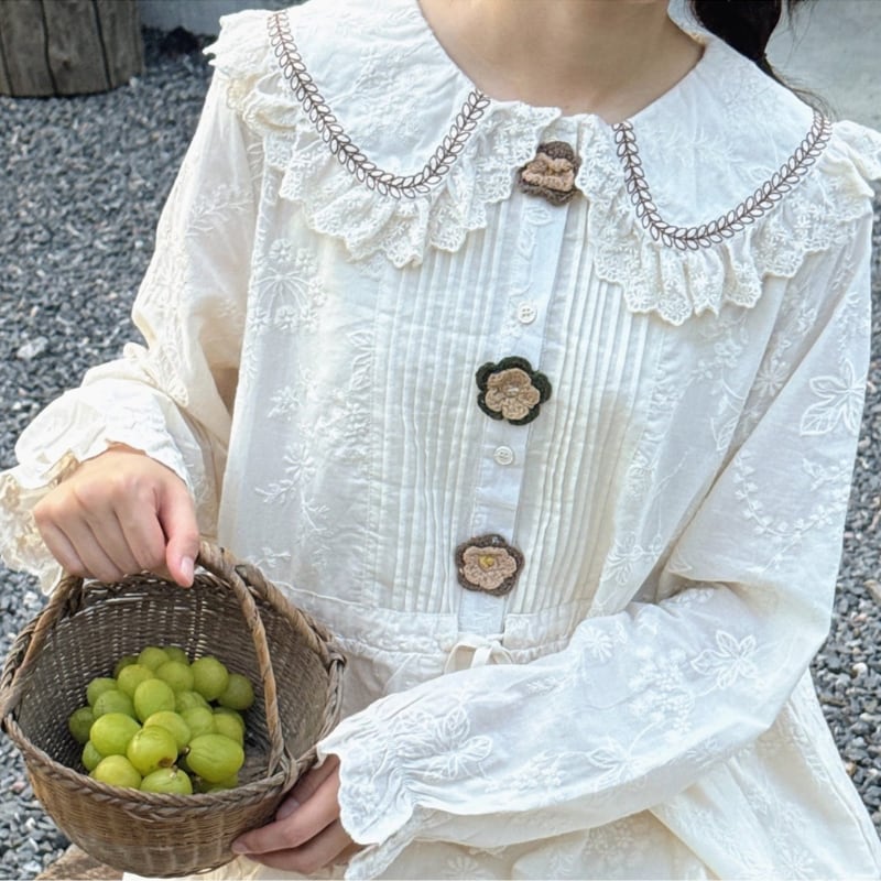 かぎ針編みのフラワーデザインがやさしく映えるロングワンピース。