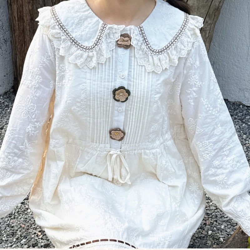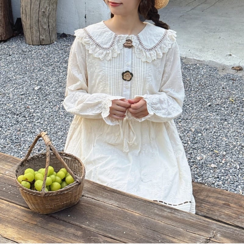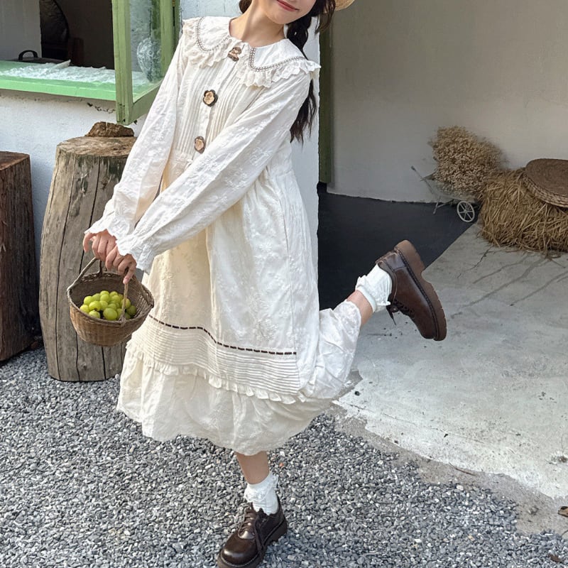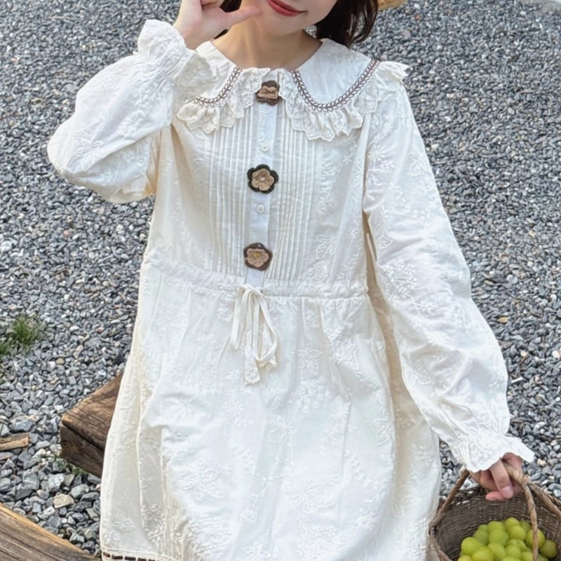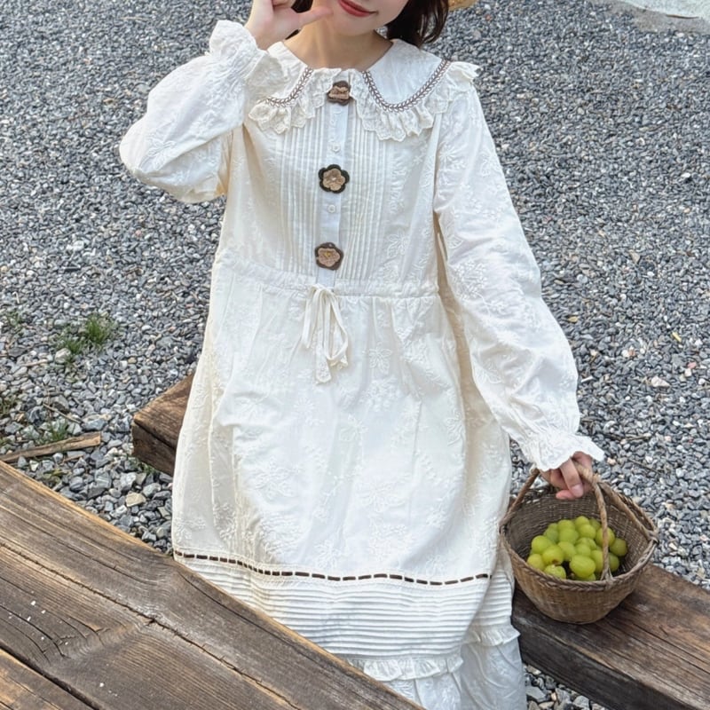 かぎ針編みのフラワーデザインがやさしく映えるロングワンピース。