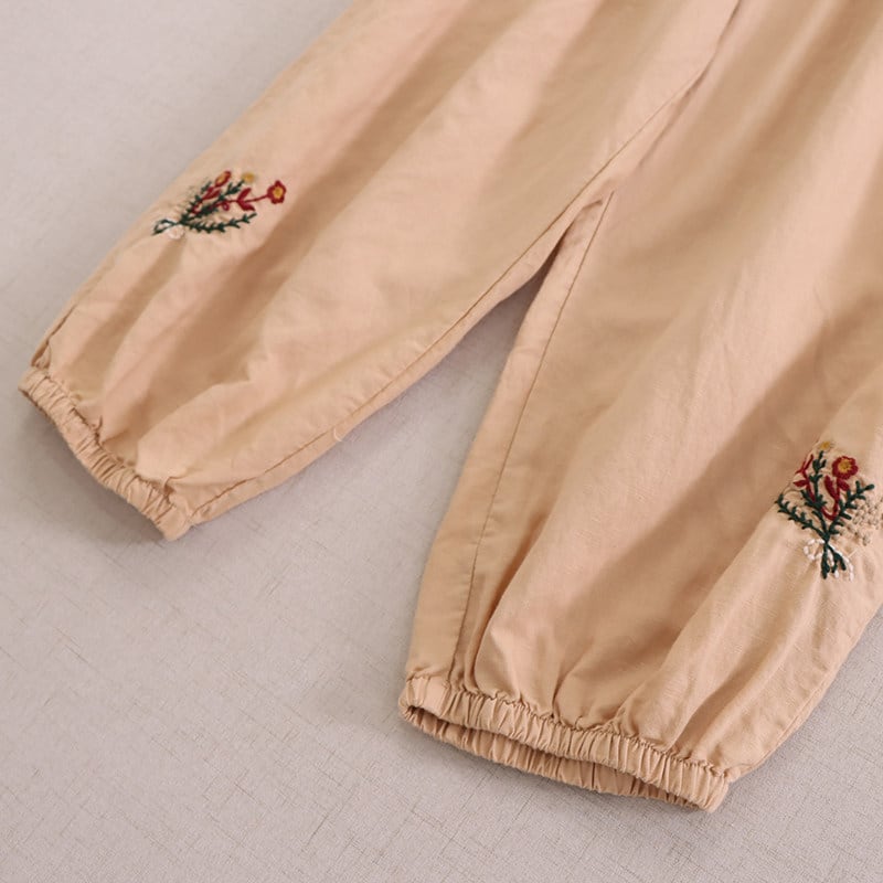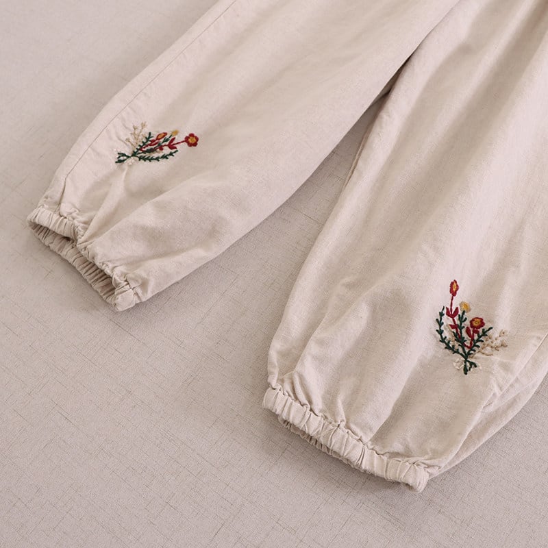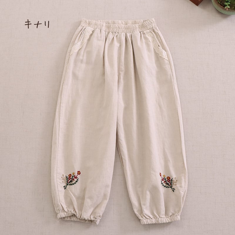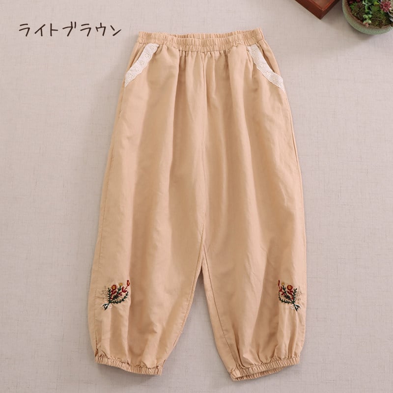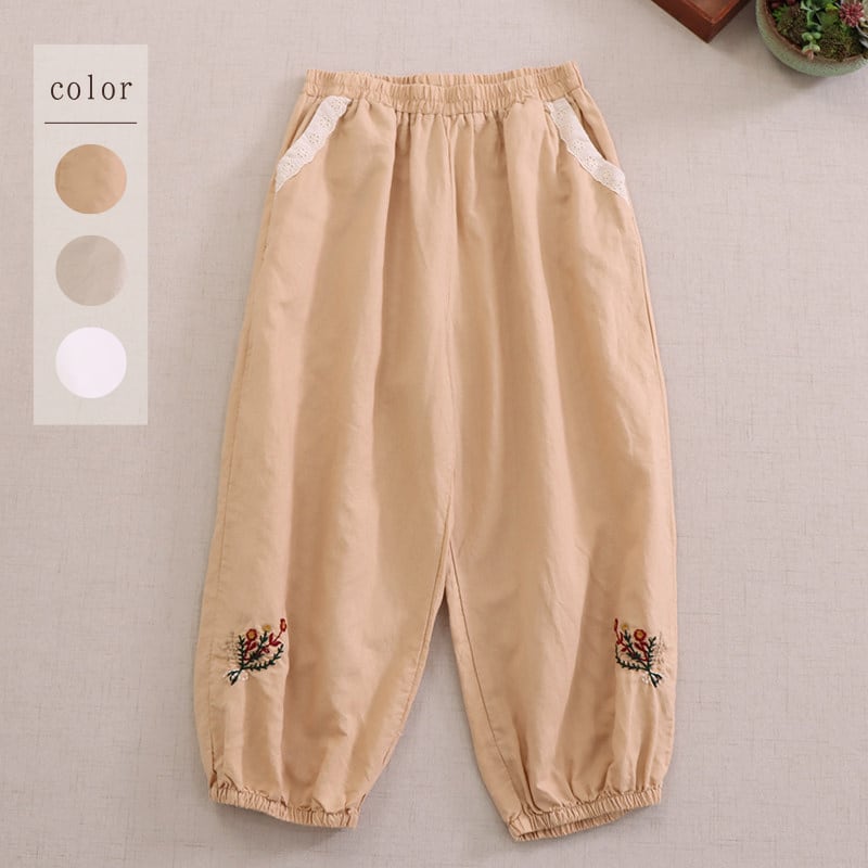 裾に施された刺繍がさりげない可愛らしさを添える、ゆったりシルエットのハーレムパンツです。