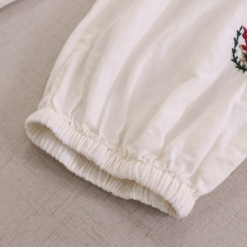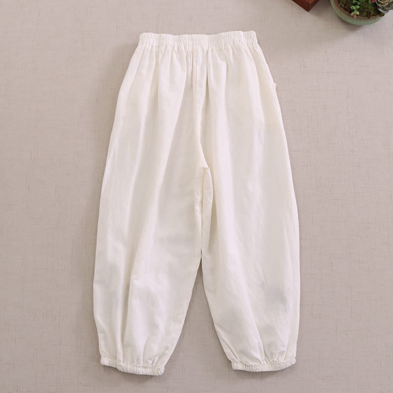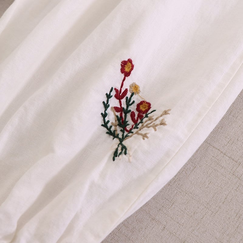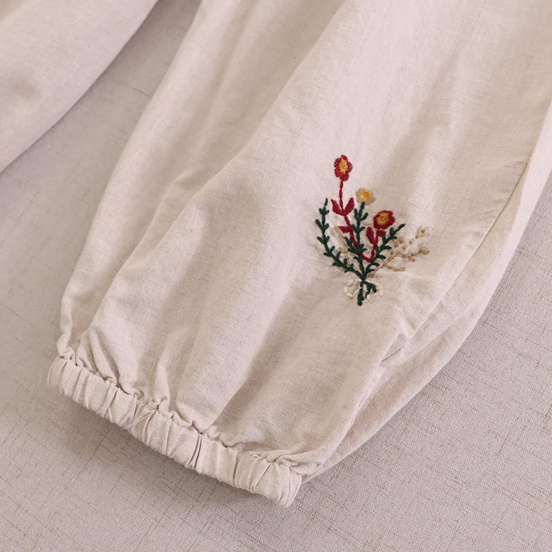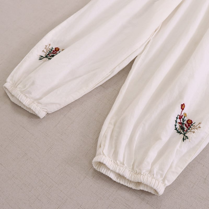 裾に施された刺繍がさりげない可愛らしさを添える、ゆったりシルエットのハーレムパンツです。
