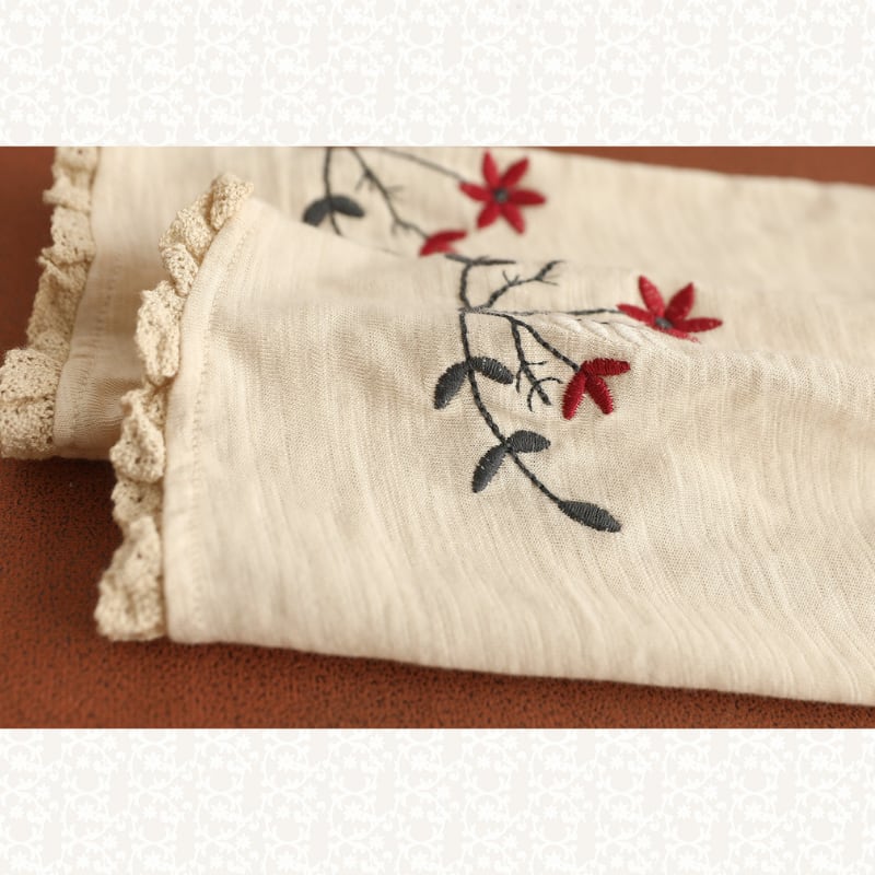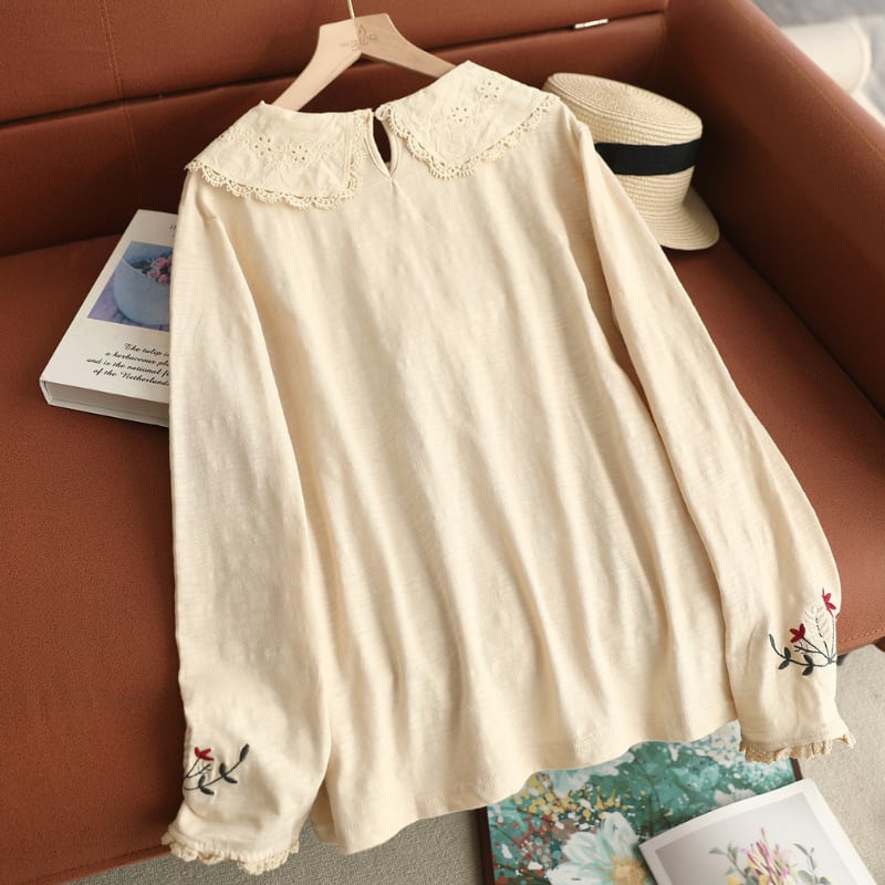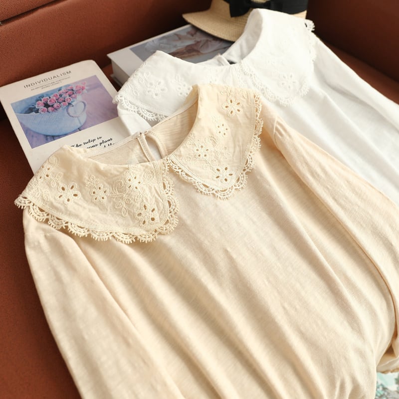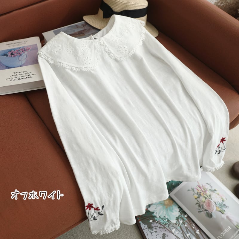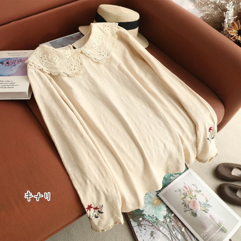 袖元の刺繍とレースの襟がふんわりと甘さを添える、やさしい雰囲気の長袖トップスです。