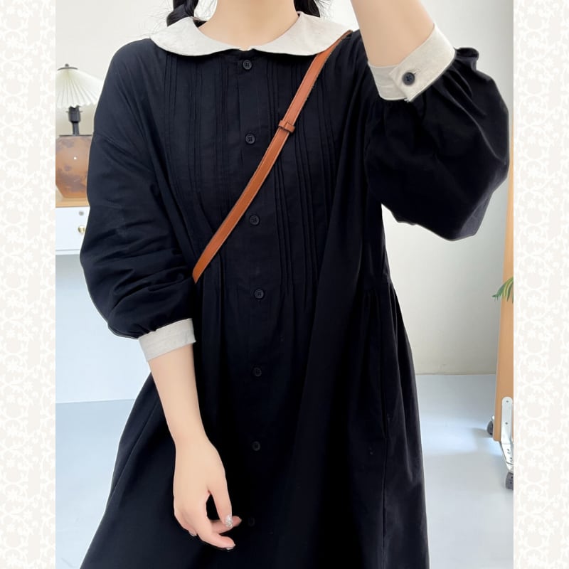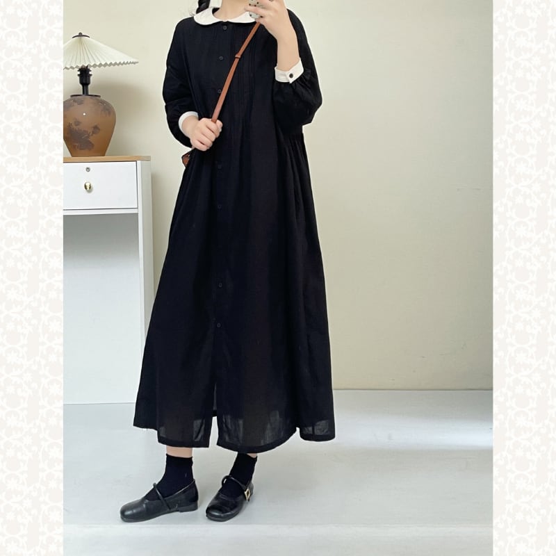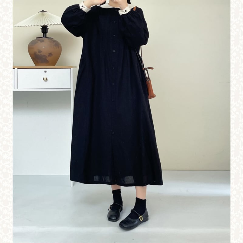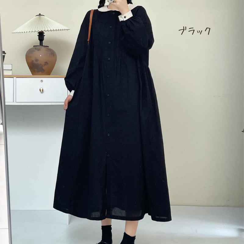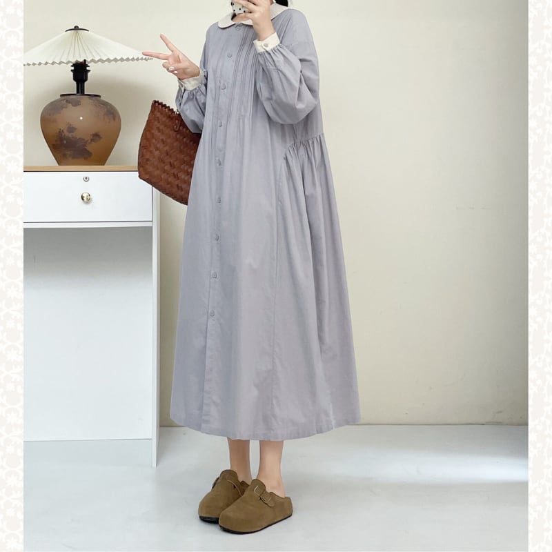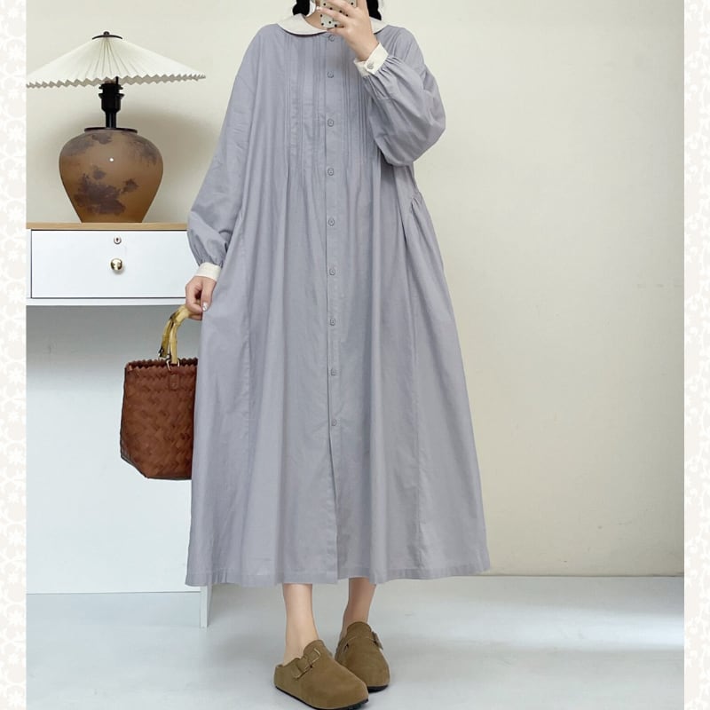 ドールカラーと細かなピンタックを組み合わせた、前ボタン仕様のロングワンピースです。